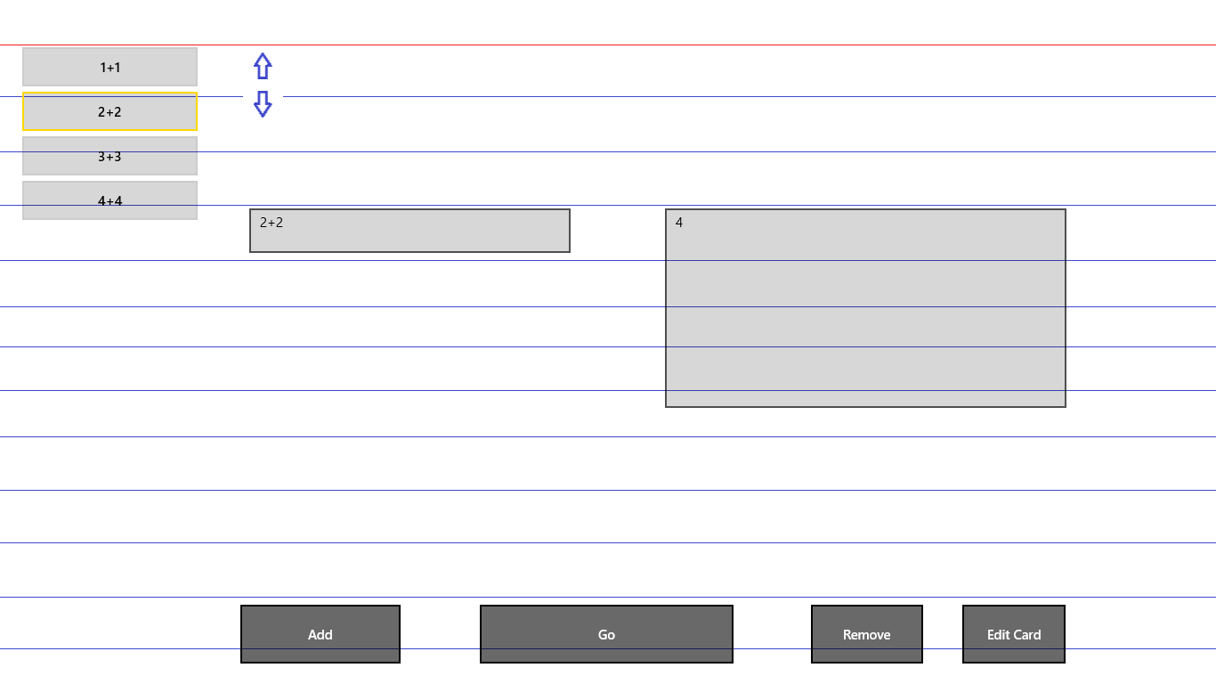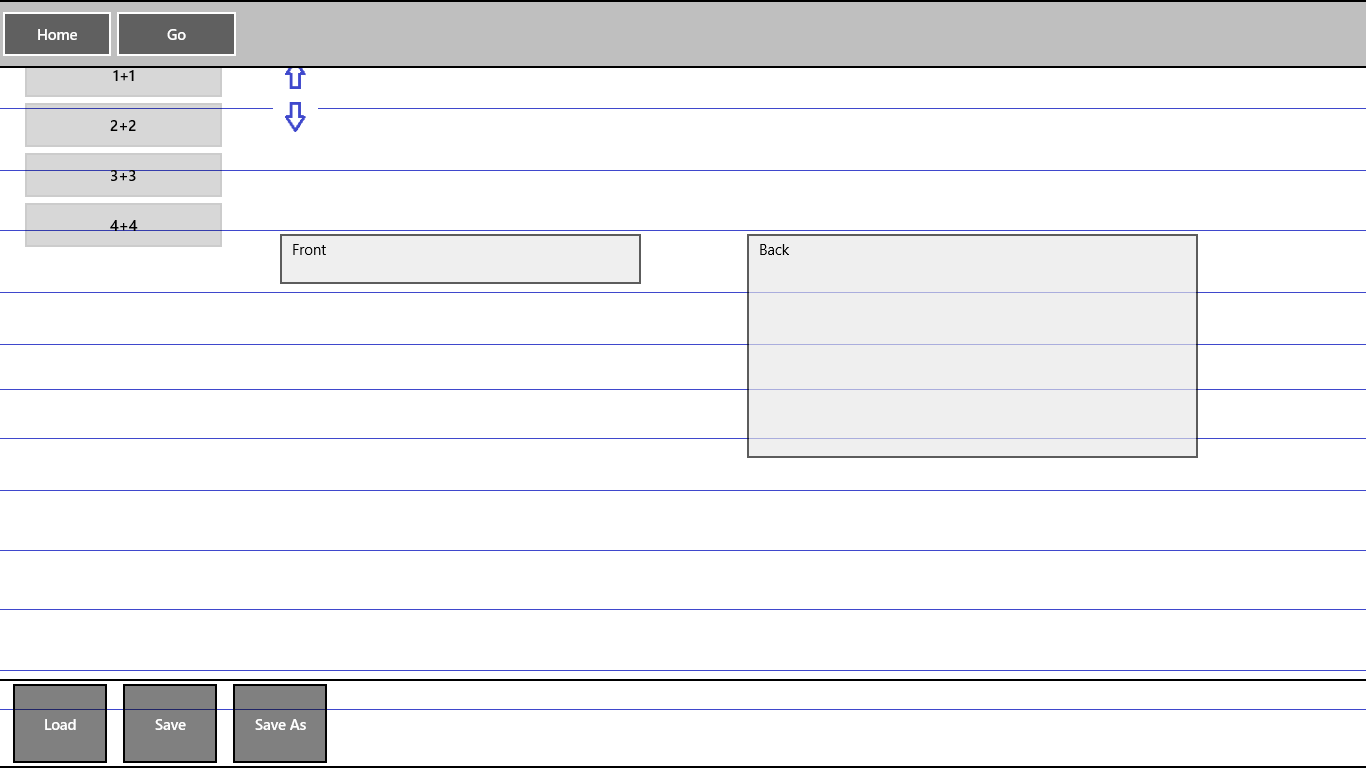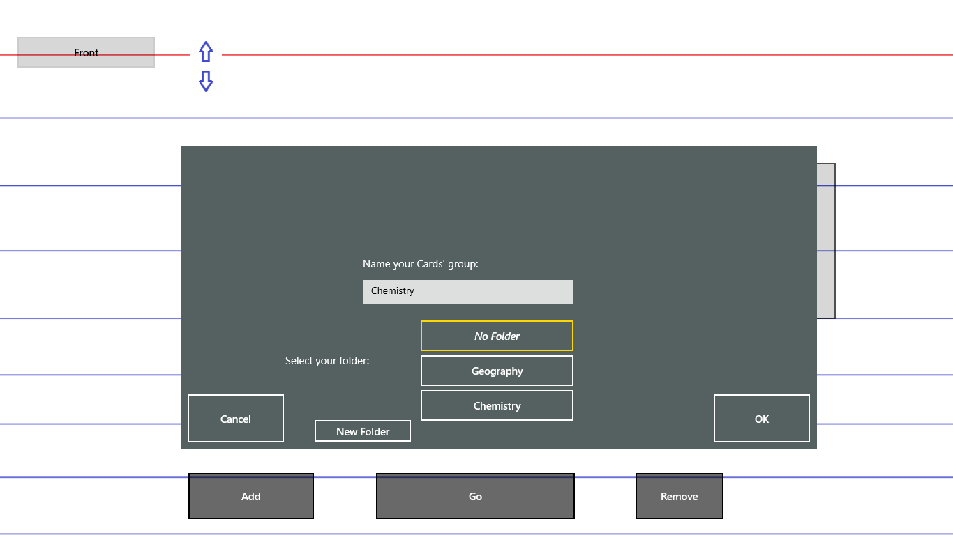 Use this app to help you memorize almost anything! You create lists of flash cards, save them, and then test yourself. In addition, you can rearrange the cards if you need to. After you have created a list, you can save it by right clicking and then clicking on "save" or "save as". This opens a dialog box, allowing you to name your group of cards. Later, when you want to test yourself or edit the list, you can right click and click on "load". A dialog box will appear with the names of all your lists. Here you can remove them or open them. If you open one and want to save it under the same name it had before, just click on "save" and it will save it without opening up the dialog box. The arrows are for rearranging the cards. To help you keep your cards organized, you can also organize them into folders.