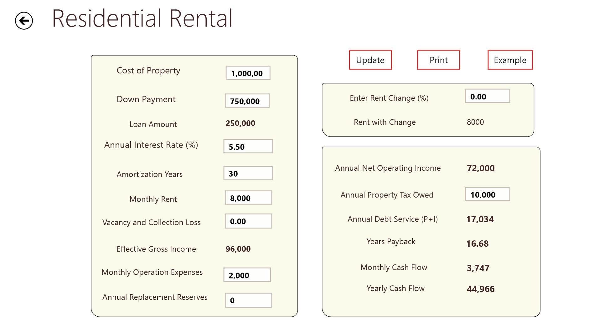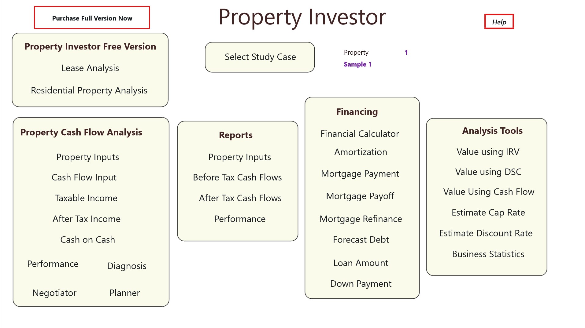 Handles up to 200 properties or leasesCommercial Financial Analysis and RatiosResidential Rental AnalysisRental Property Cash Flow AnalysisProperty Negotiator – tool to help you purchase propertyProperty Planner – long term investment analysis with reversionProperty Valuation using three methodsEstimate Capitalization RateEstimate Discount RateDown Payment Analysis based on Debt Service Ratio and NOILoan Amount based on Debt Service Ratio and LTVLoan AmortizationForecast Debt over timeBusiness StatisticsMortgage and Mortgage PayoffMortgage RefinanceFinancial Calculator -Time Value of Money – Present and Future Value, Payment, Interest and Term calculations with easy to use menusContains many advanced financial calculations for Net Present Value and Internal Rate of Return, Amortization, Mortgage Payment, Compounding, Refinance, and Interest Rate ConversionFinance functions of Annuity, Retirement and 401K, Bonds, Capital Gain and Credit Card
