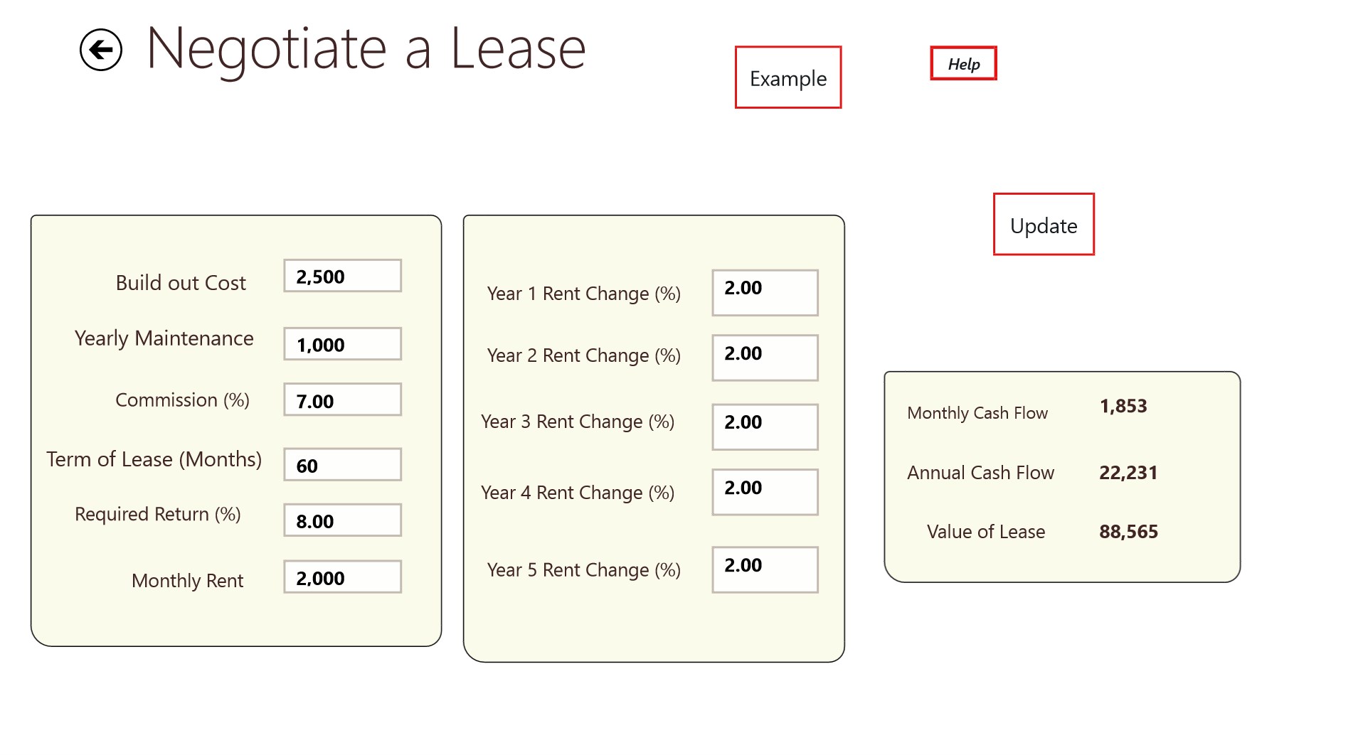 Most likely you will be negotiation with someone in the purchase of the property. It may be a bank or an individual. For this we have provided you with a Negotiator. With this you can study the impact of how much you pay for the property and how much down payment you make. It provides the payback, the cap rate and the after tax cash flow for each turn of the wheel. It is your own personal Negotiator.