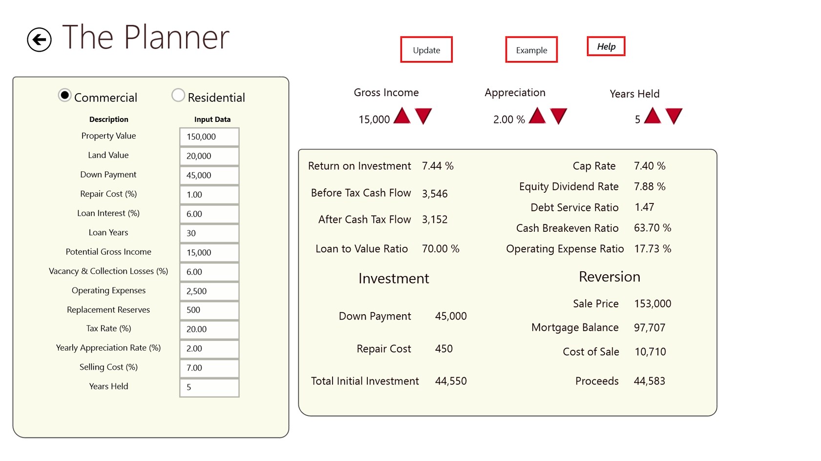 We also have provided you with a Planner. It allows you to quickly study various scenarios of rental income, expected appreciation rates and the number of years you intend to hold the property on the overall return on investment. Just twirl the wheel and the answers appear , it is easy as that.