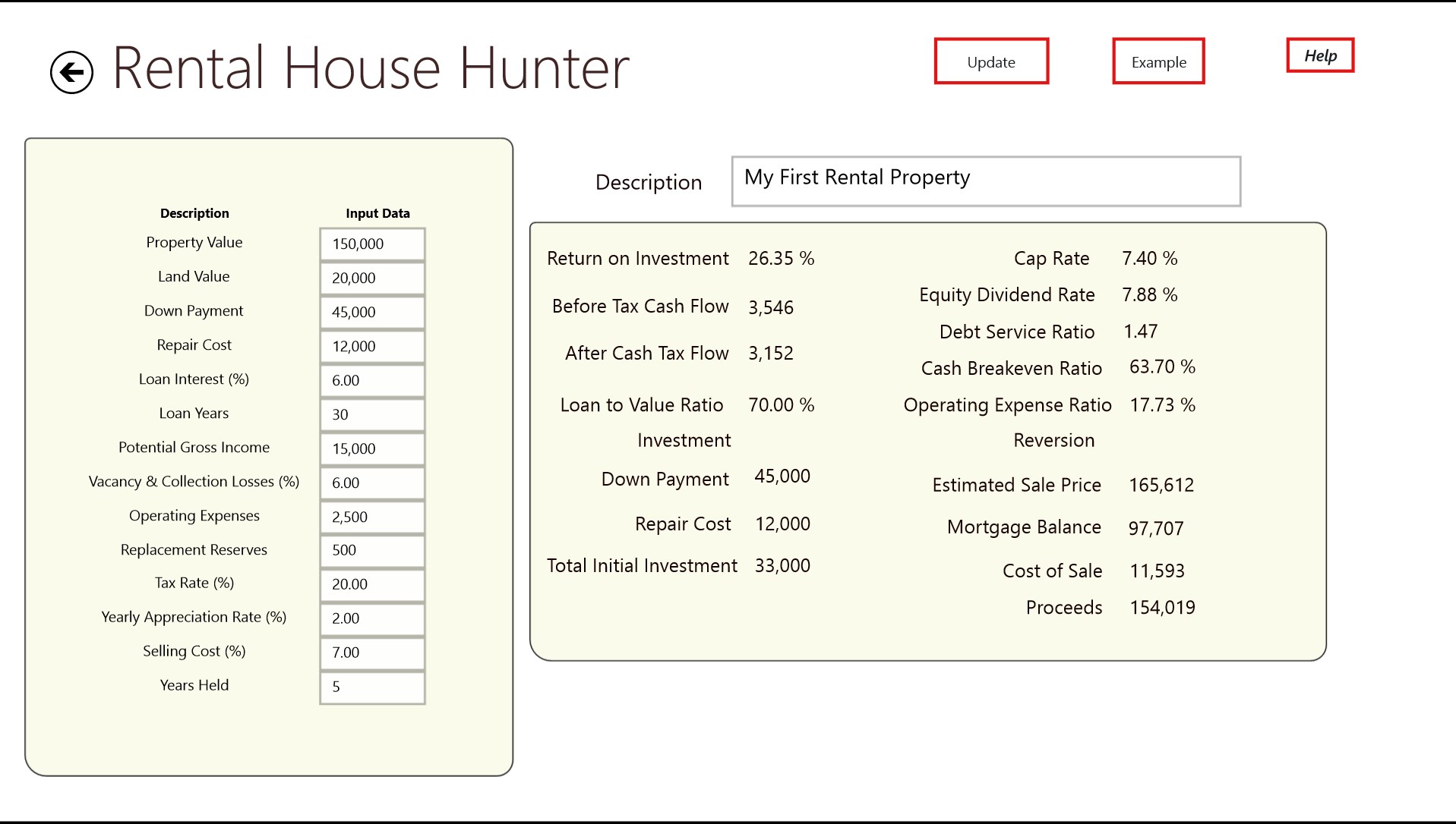 This app analyzes your cash flow and operating expenses, it determines an overall rate of return on the investment and gives you the financing information for you to make the right decisions.
