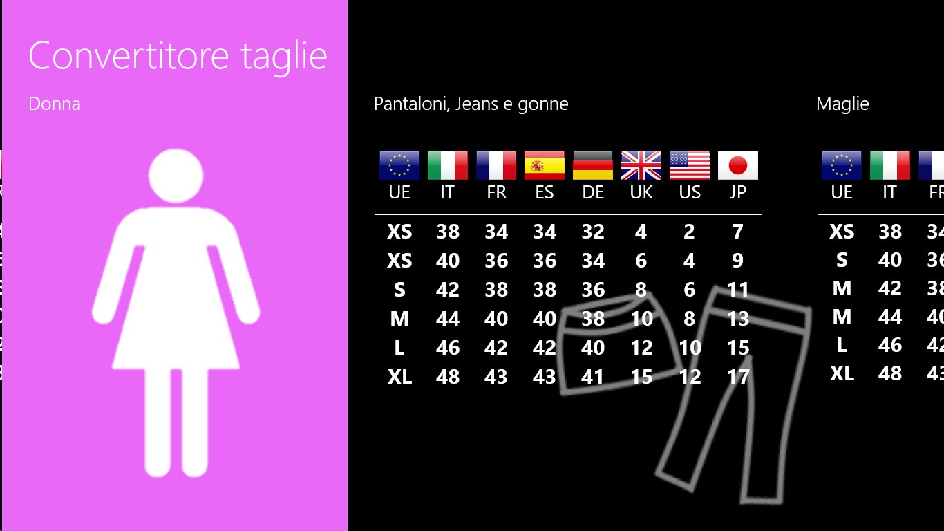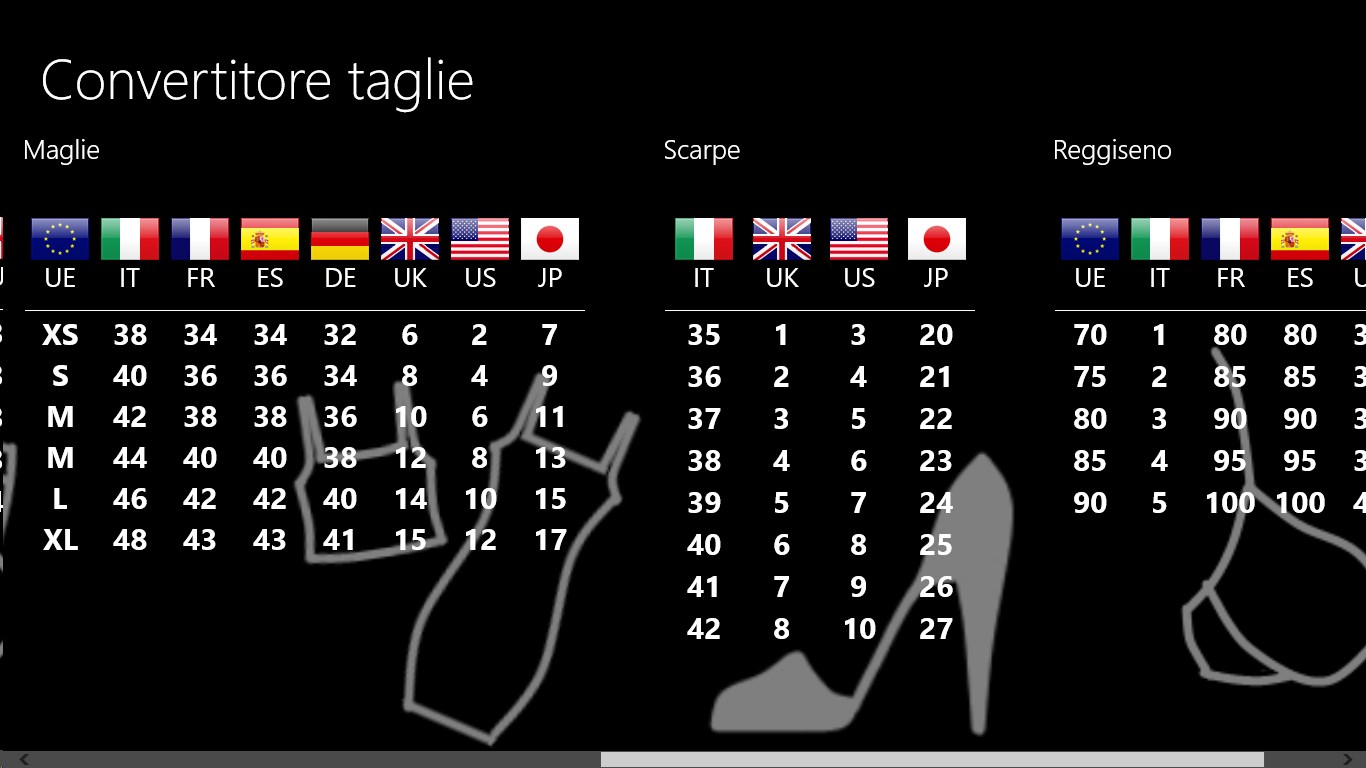 Permette di convertire le taglie dei vestiti, scarpe ecc per varie nazionalità