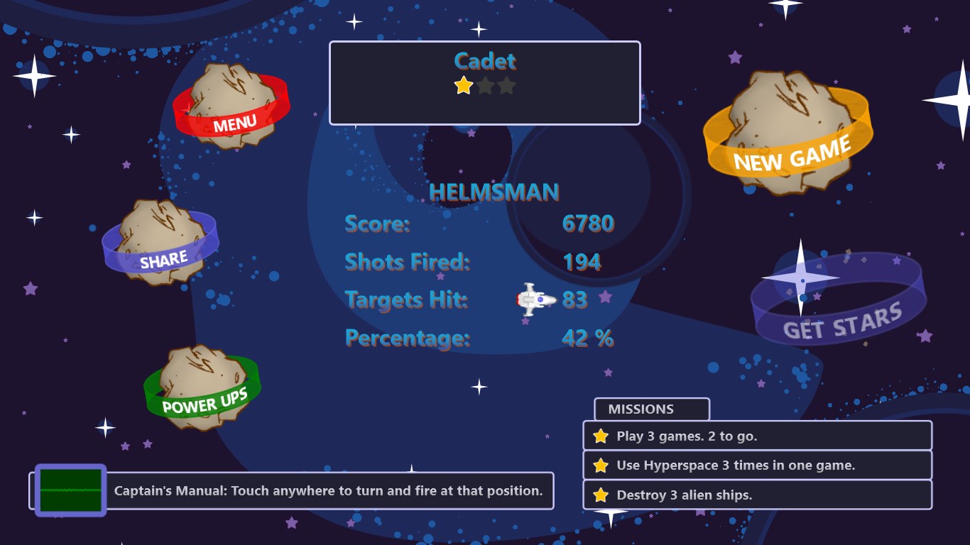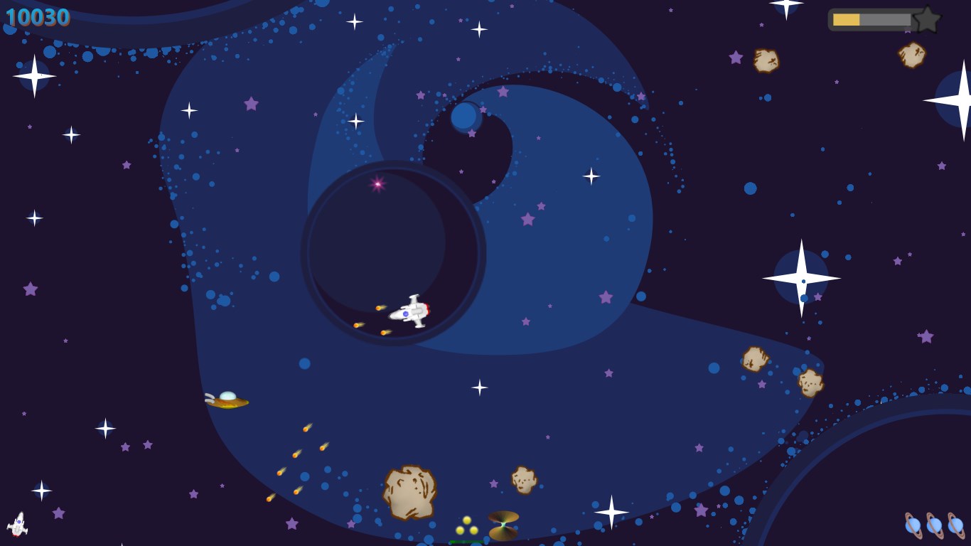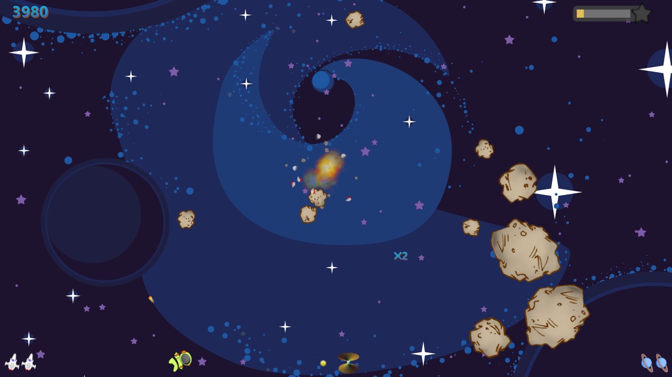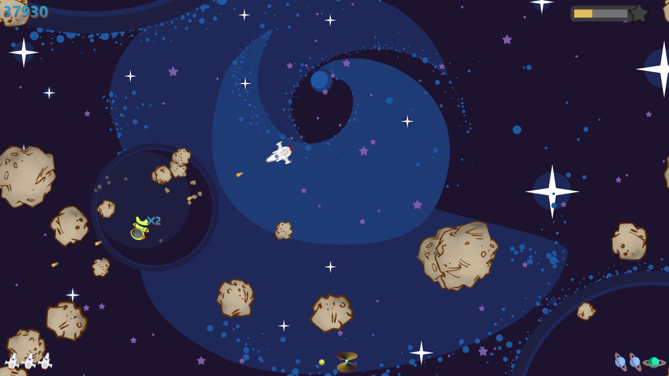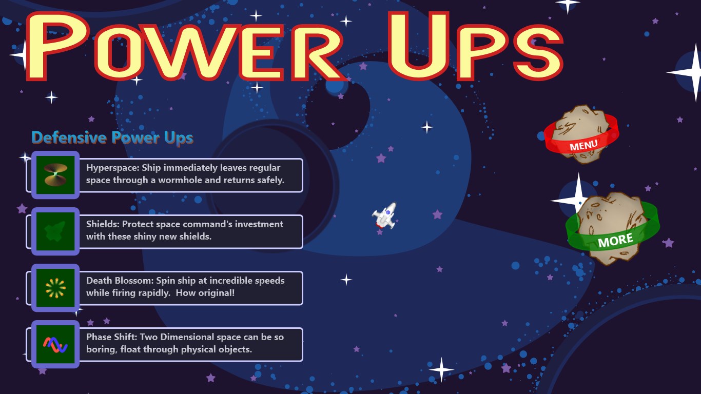 Hyperspace with spatial distortionMissilesTriple shot cannonsNext level advanceTime DilationUnlimited fire speedBonus points for meteor groupsScore multiplier for streaksDeath blossomPesky aliensLeaderboards separated by play modeIndividual statisticsTips system based on skill levelPlayable menu screen