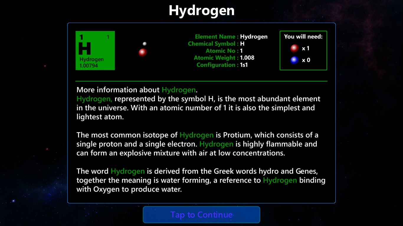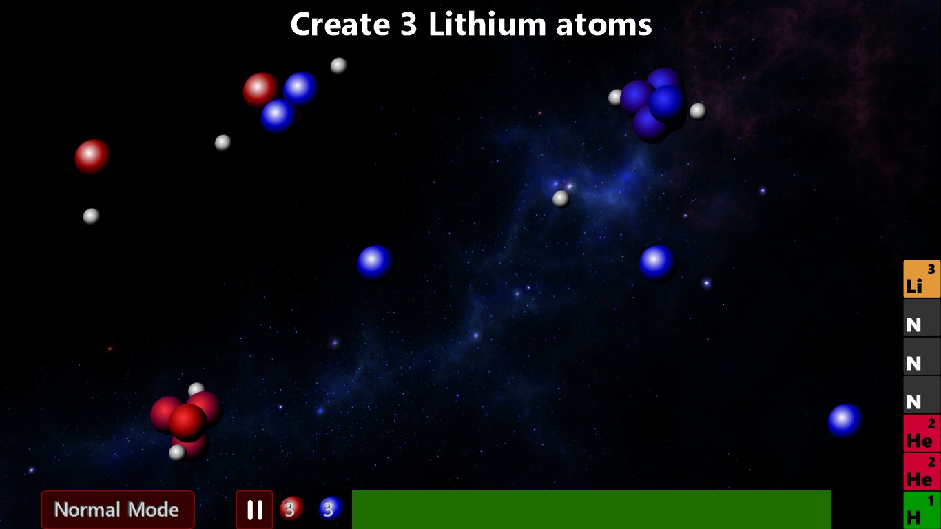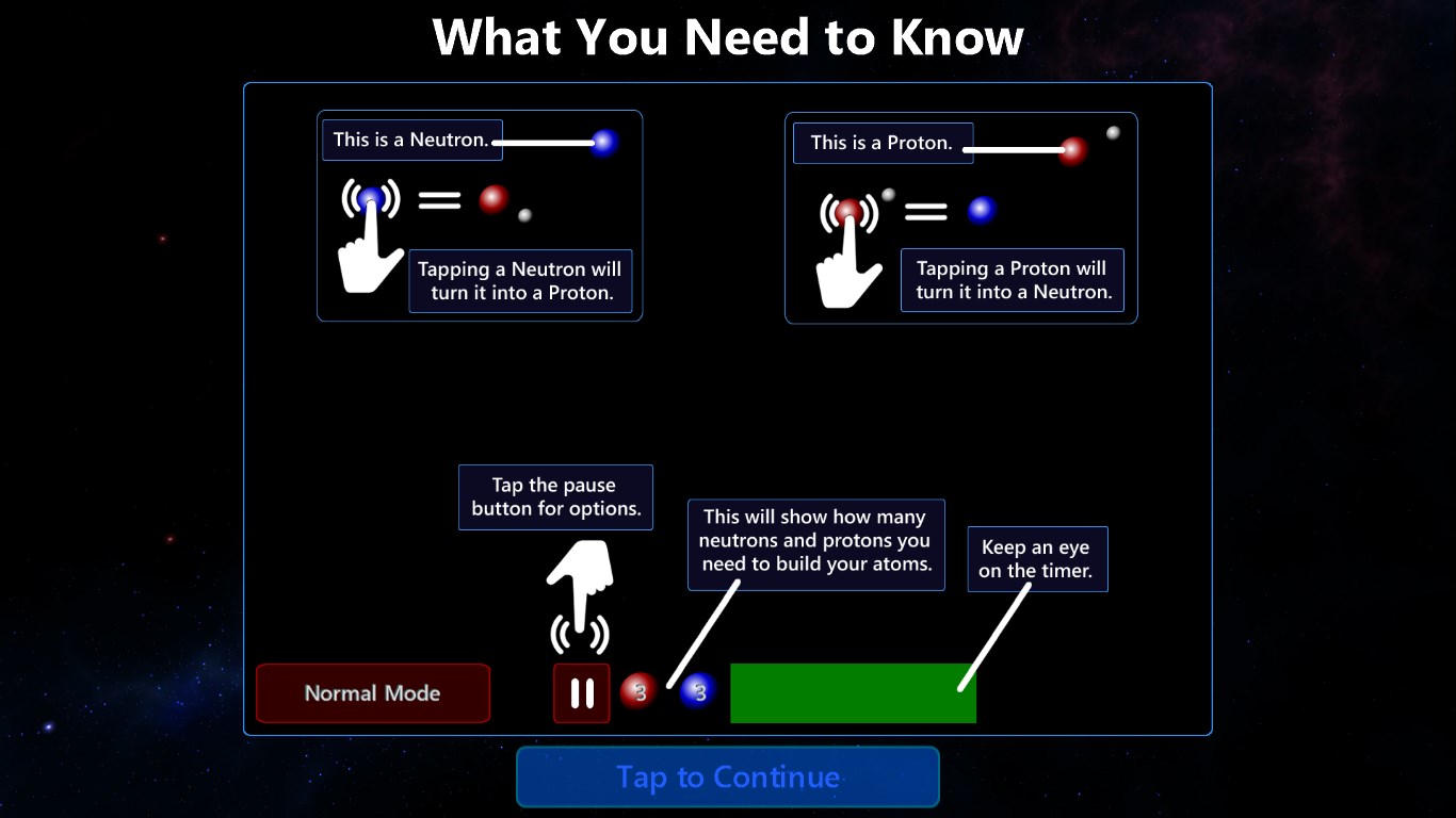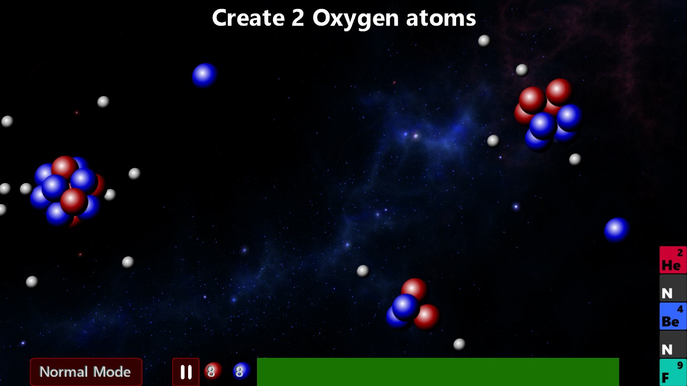 Convert neutrons to protons and vice versaFire particles into each other to build bigger atomsTry to stabilize decaying atomsSplit atoms with the touch of a finger18 levels of increasing difficultyLearn while you playTry to achieve a perfect 3 electron rating across the table