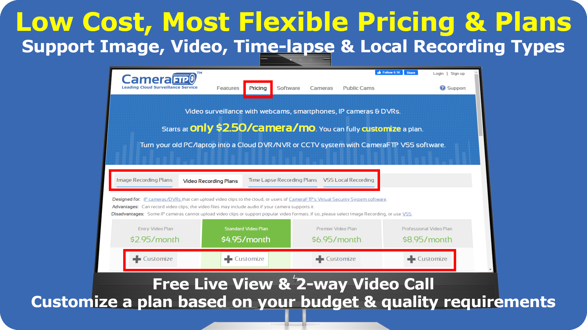 CameraFTP is a leading Cloud Surveillance and Recording service provider. Our service works with IP cameras that support FTP (most IP / network cameras do support FTP). You don't need to order any expensive proprietary cameras; you can even use webcams, smart phones and tablets as your security cameras. The service starts at only $1.50/month/camera for image recording and $2.50/camera/month for video recording.