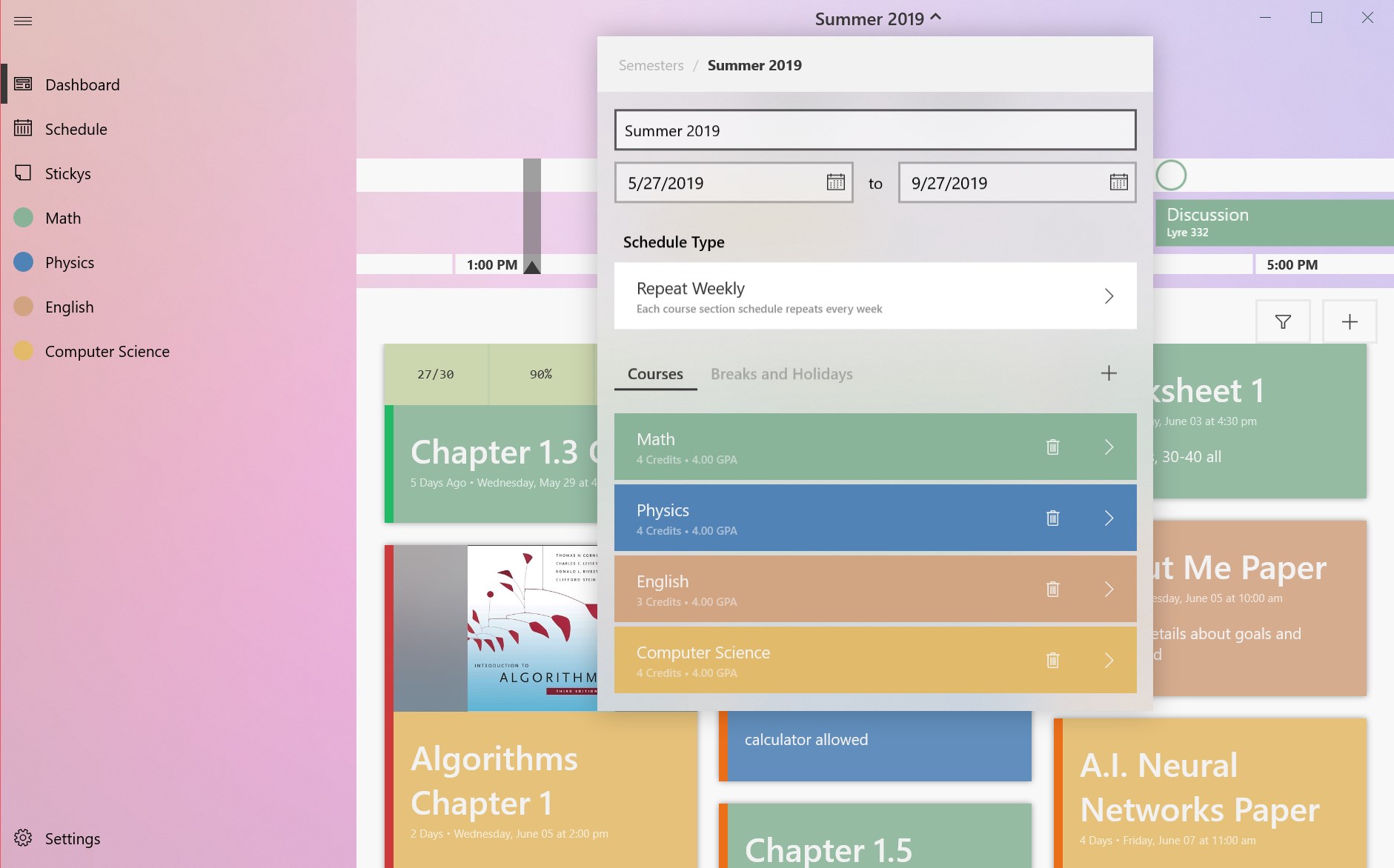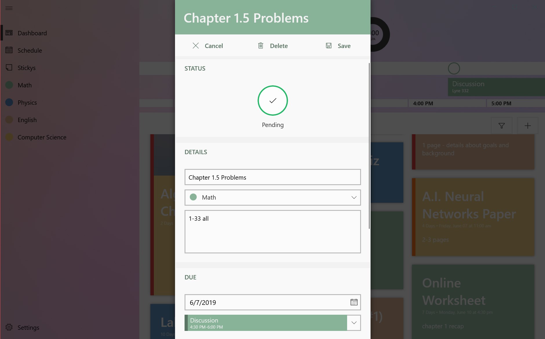 Create full course schedule and structure, including instructors and semester breaksKeep track of all assignments, readings, and tests in one easy to use dashboardPlan ahead with a handy schedule viewKnow what\'s coming next with the schedule ticker which shows upcoming course meetings and assignments dueTrack top-of-mind notes and ideas on the stickynote dashboardTrack your grades all the way through the semesterUse the grade predictor tool to know what it takes to get the best possible gradeGet notifications before your items are due and before course meetings start