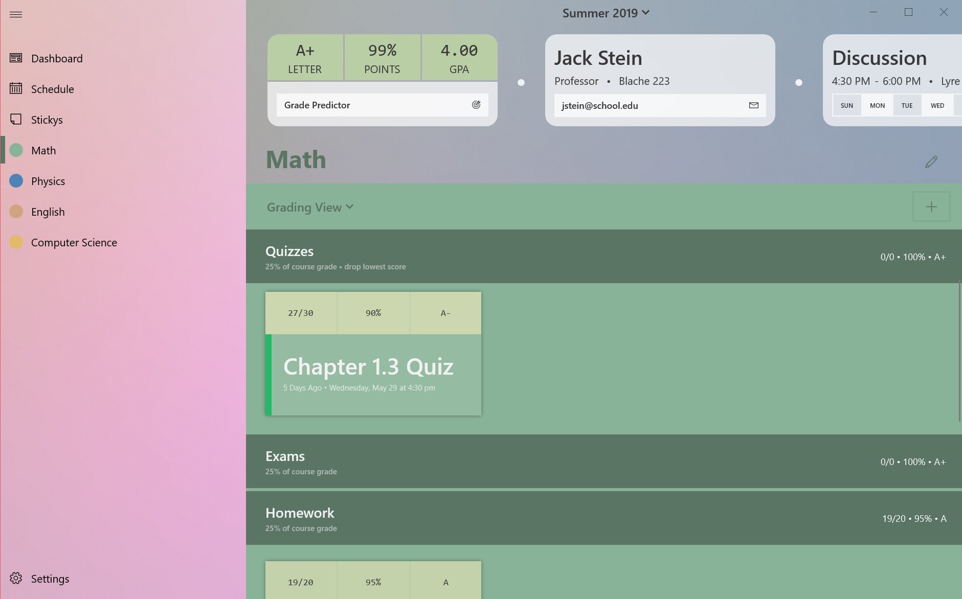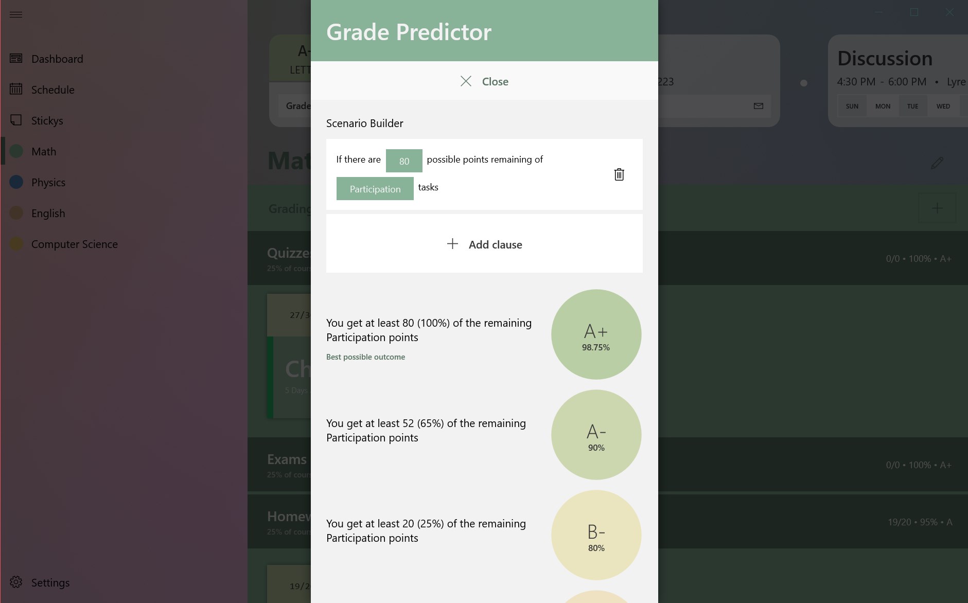 GRADES AND GPA – Know where you stand all semester long with grade and GPA tracking. Customize your grading scale and use the grade predictor to know what you need to do to get the best grade possible! Grade tracking supports robust features like grading curves, dropping grades, grade categories, and automatically dropping your lowest score.