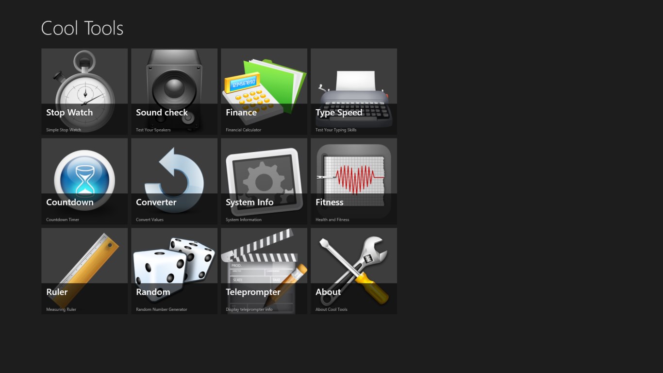Stopwatch, with lap timeCountdown, with alarmRuler, with adjustable calibrationSound Check, with THX clipsConverter, with many conversion typesFinancial Calculator, with many categoriesRandom # Generator, with range fieldsSystem Info, with device capability listTeleprompter, with adjustable speedType Speed, with words per minuteFitness tool, with BMI calculatorNote Taker, with multi line