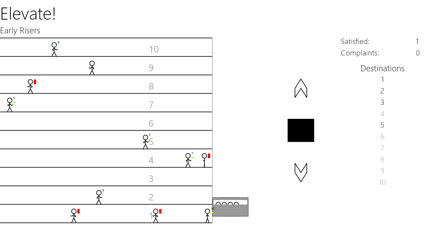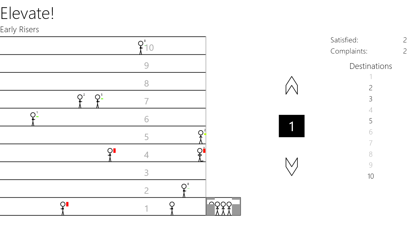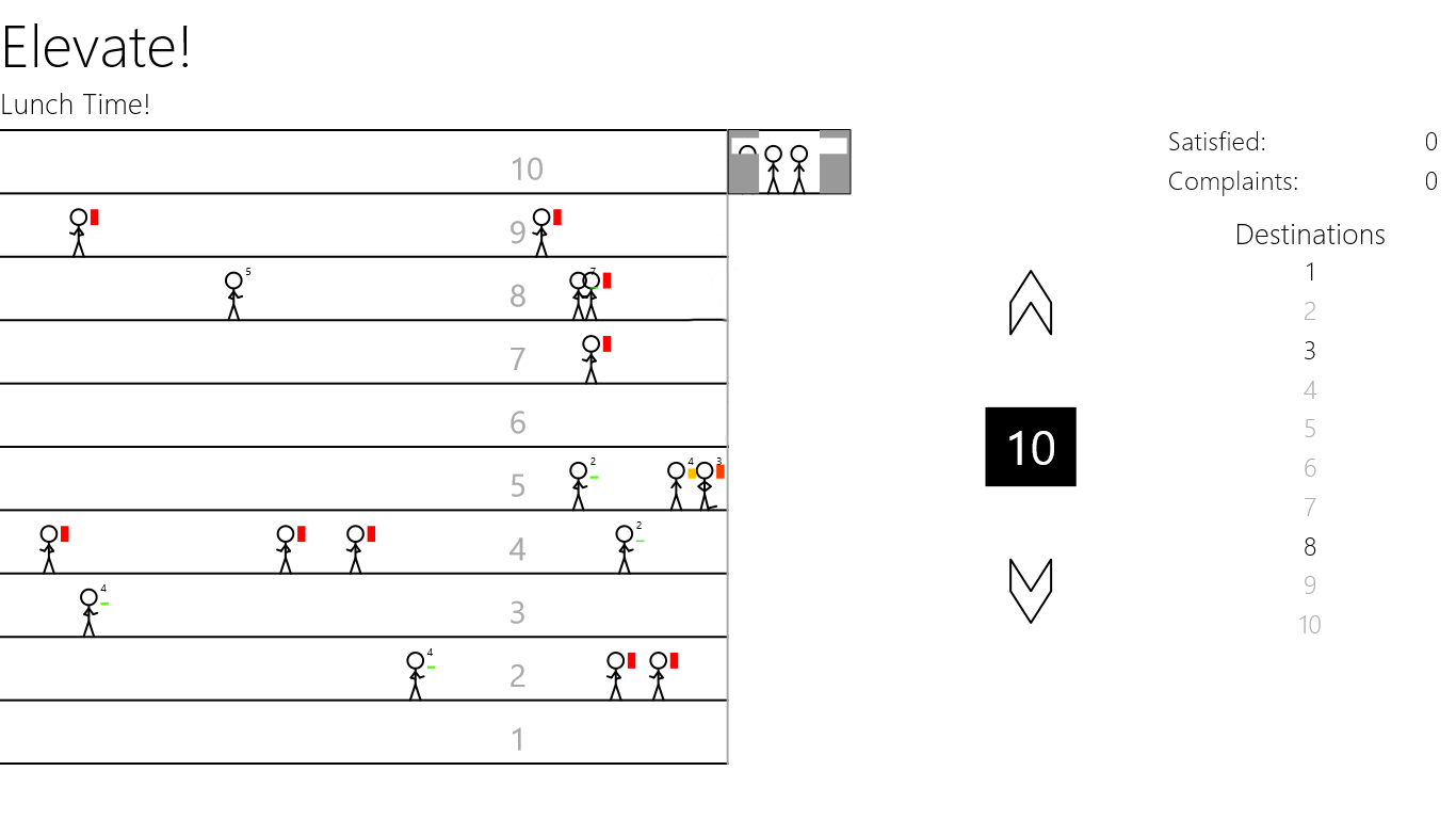 In your new position as an elevator operator, you're tasked with delivering the stick-figure occupants of a 10-story building to all of their desired floors. In the morning, your task might be easy, but as the day progresses and more people arrive, keeping all the building's occupants happy will become more difficult. Try to be efficient because nobody likes wasting time waiting for the elevator. If too many complaints are registered, you'll lose this new job.