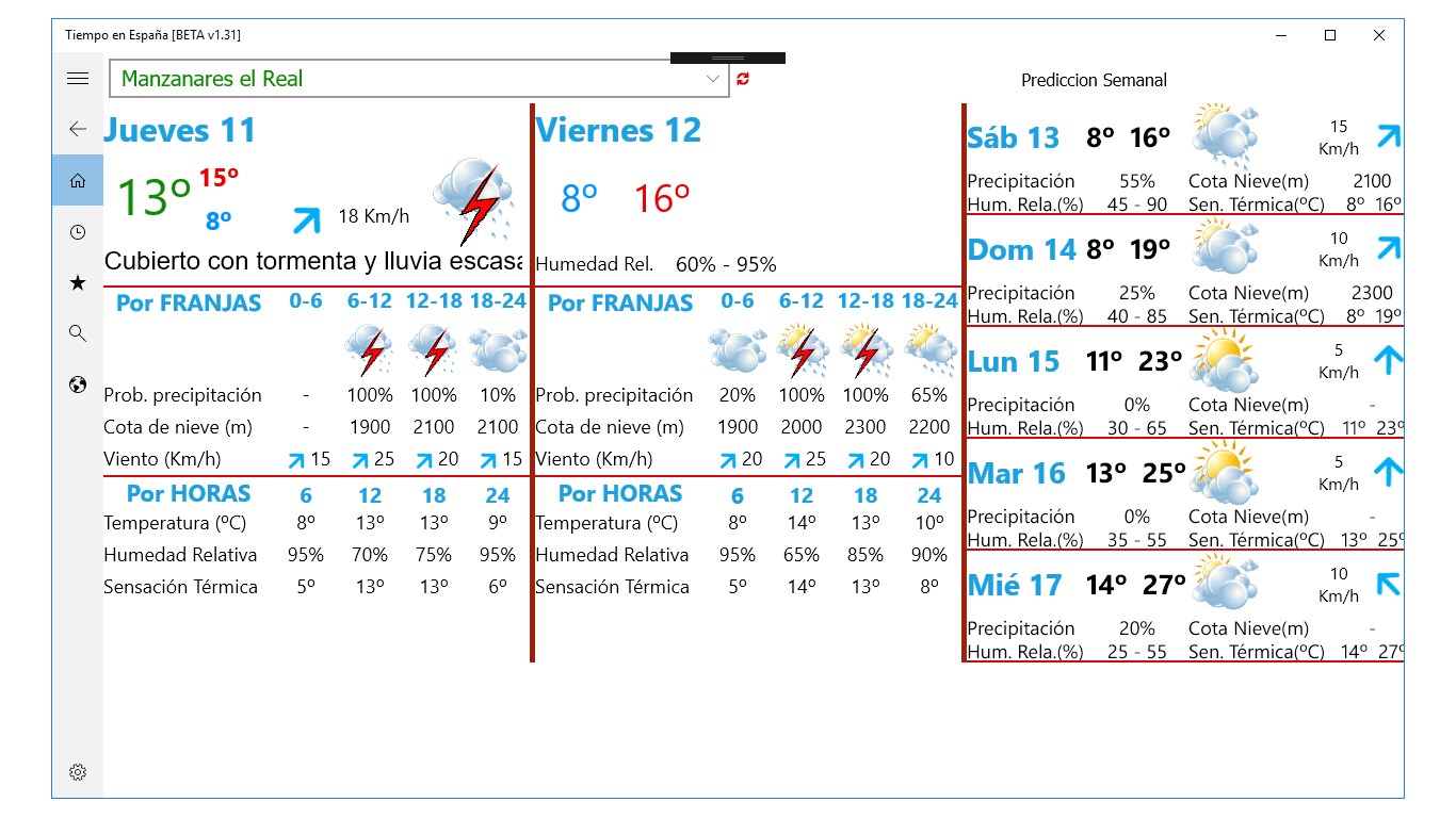 -Información detallada de todo tipo: probabilidad de precipitación, humedad relativa, cota de nieve, viento, sensación térmica, índice ultravioleta, ... además de altitud y habitantes
