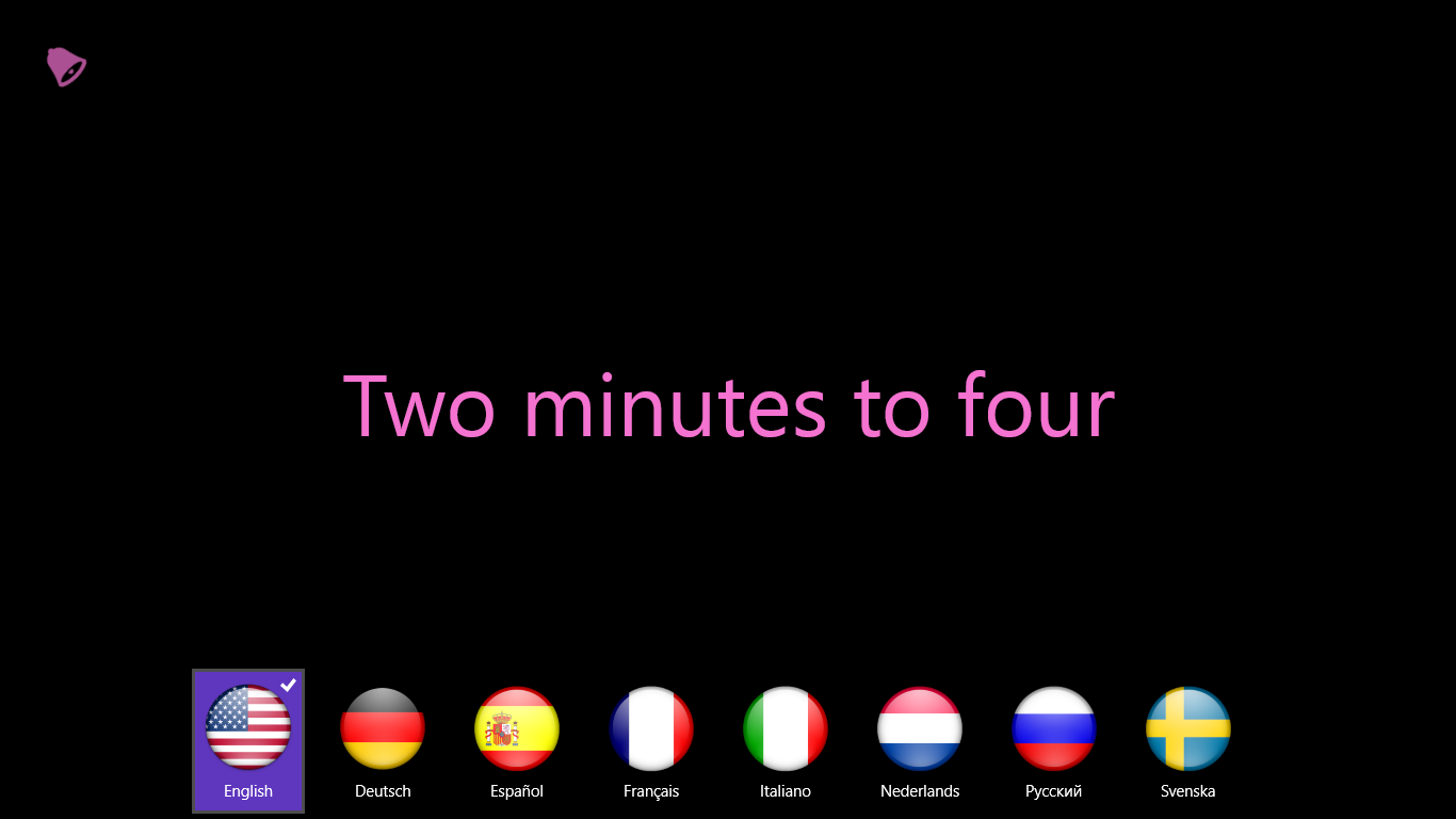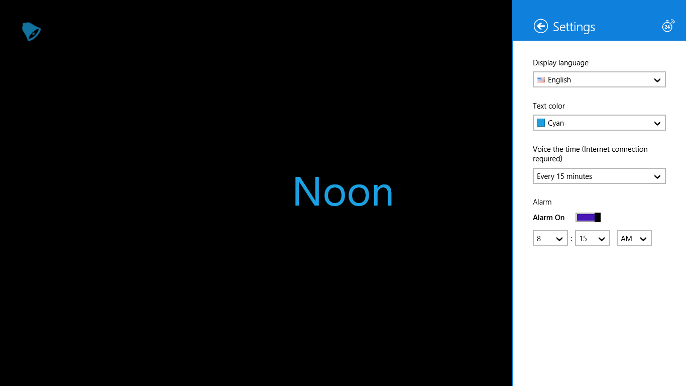 Textual, digital and graphical clock representation.Tapping text causes the clock to voice the current time.Screen gestures allow to switch current language and colors quickly.Alarm clock can be set to the particular time and it will wake up even if application is not running.In digital mode the clock uses huge font size for better vision.Voice intervals and text color are adjustable.