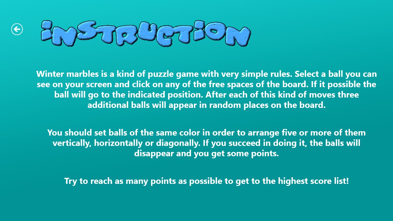 Winter marbles is a kind of puzzle game with very simple rules. Select a ball you can see on your screen and click on any of the free spaces of the board. If it possible the ball will go to the indicated position. After each of this kind of moves three additional balls will appear in random places on the board.