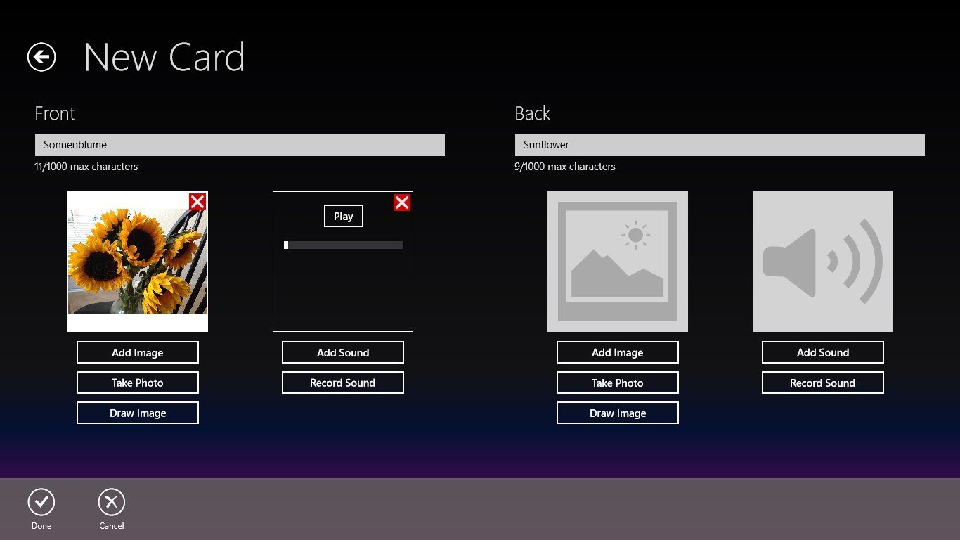 Create your own flashcards and share with friendsCreate flashcards using images, sounds and text, or draw your own.Replay the cards you got wrong or skipped, and repeat until you get them all rightView and rearrange flashcards in sequential or random orderNavigate through the cards and keep score using touch or keyboard gestures