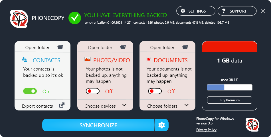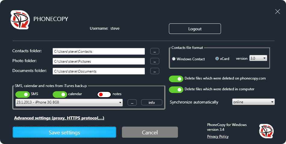 You can use this application to back up SMS, calendar, and notes from iPhone. To sync contacts and photos, install our PhoneCopy app from the Apple Store.