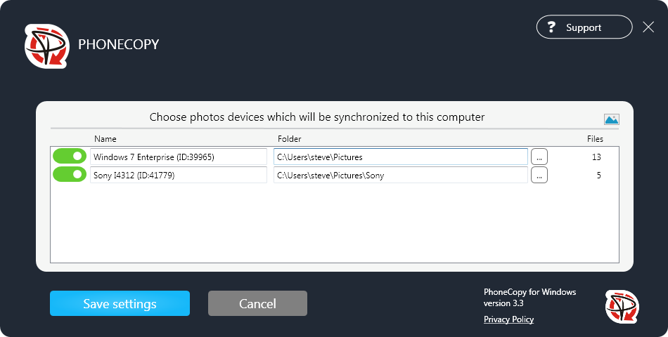 You can back up photos and videos from mobile phones to your computer, where they can be easily viewed and sorted. If you have multiple devices, a separate folder is created for each device. You can also create galleries from your photos. After setting visibility to "public", your galleries will appear on our PhoneCopy web gallery where people can view it.