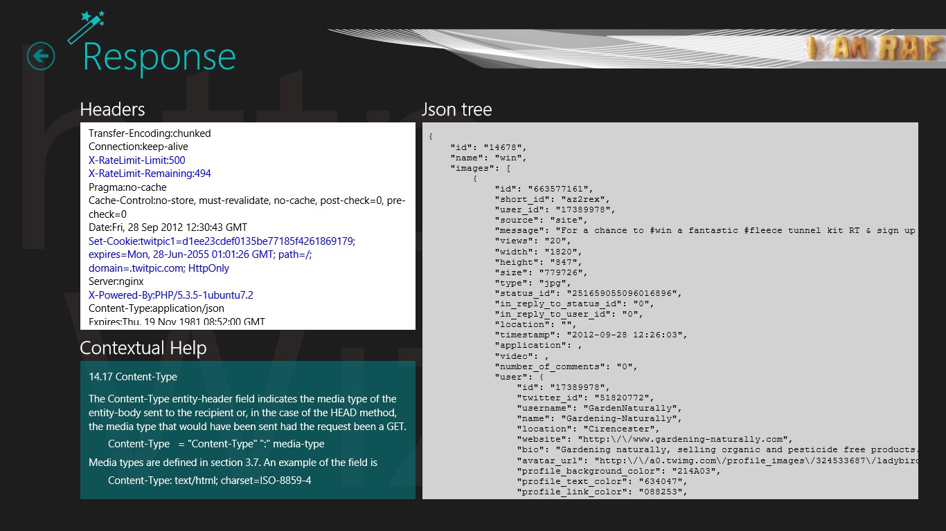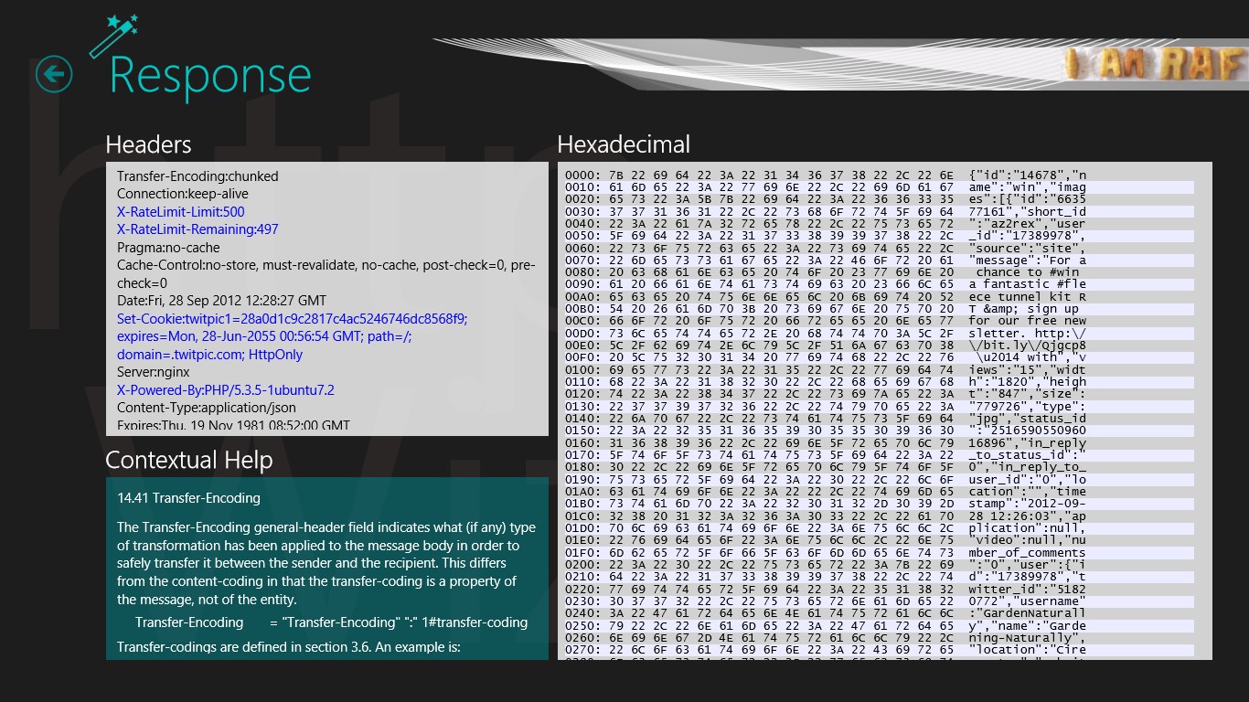 Developers can use HttpWizard to issued arbitrary http request controlling headers and payload, and analyzing in details the response. This tool can transform the response in a nice view (formatted json, xml, images) or a raw mode in order to see what bytes has been returned from the server.