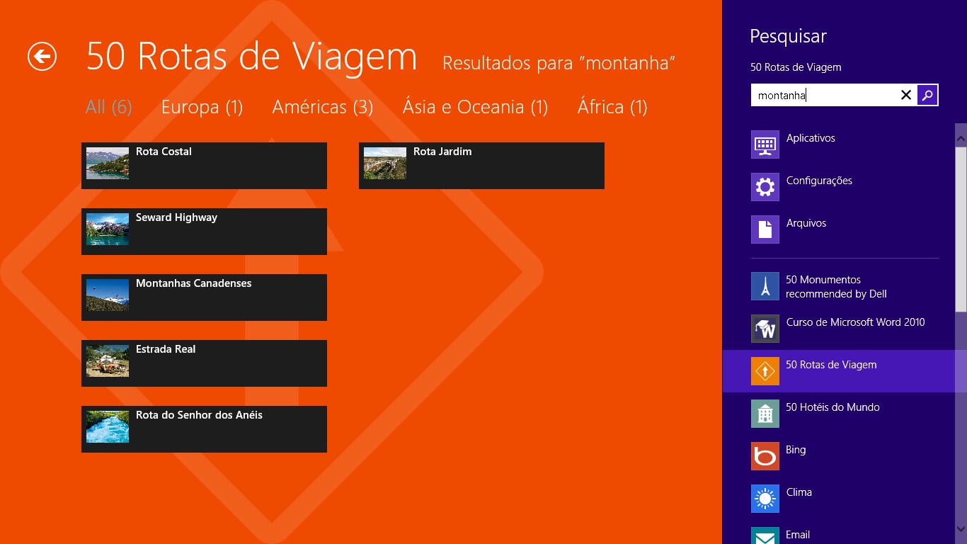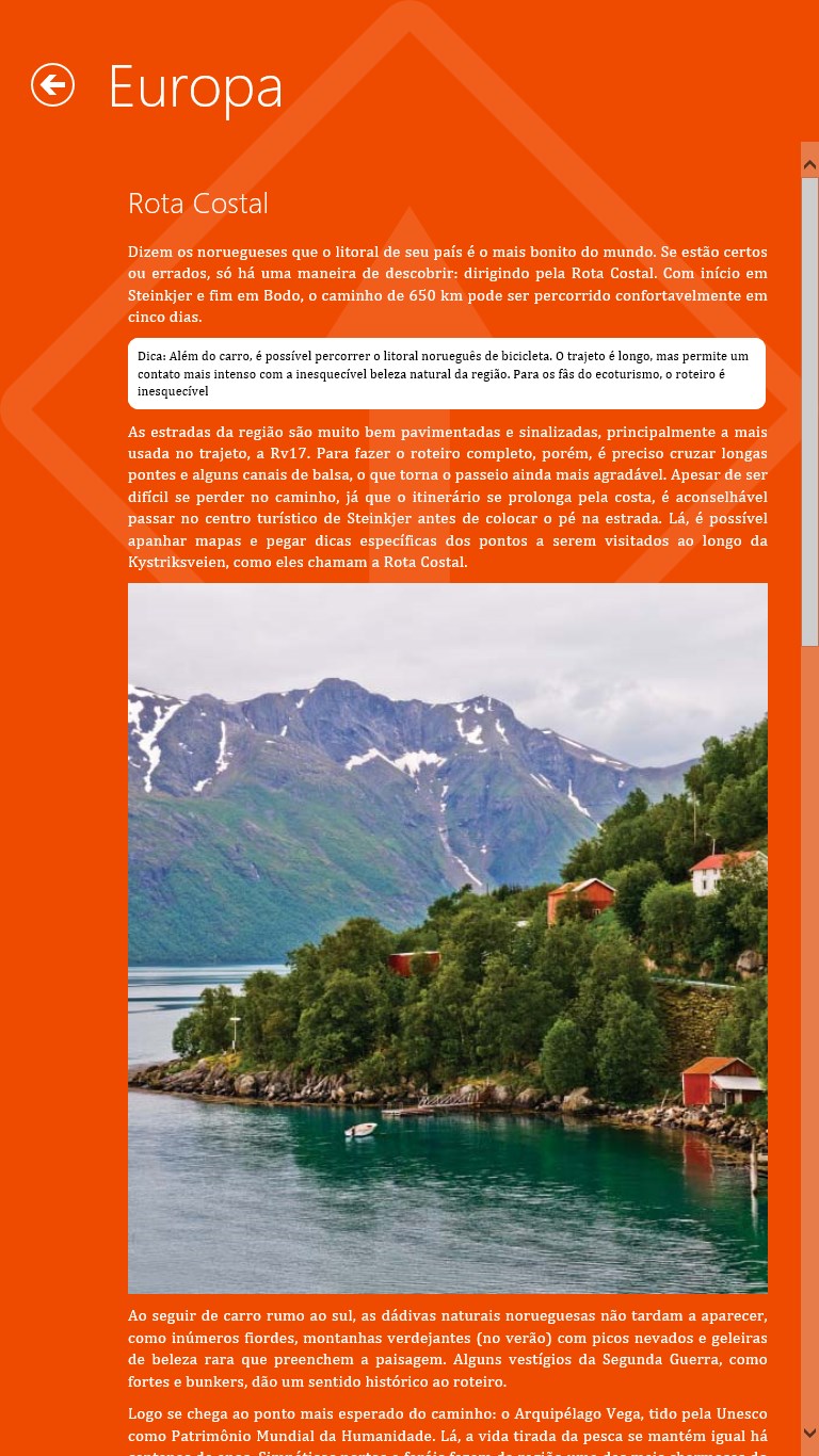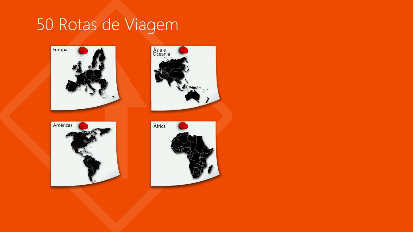 Textos descrevendo as 50 rotas de viagem com fotos mostrando detalhes de cada um deles.Busca por palavras-chaves e agrupamento por continentes do mundo.