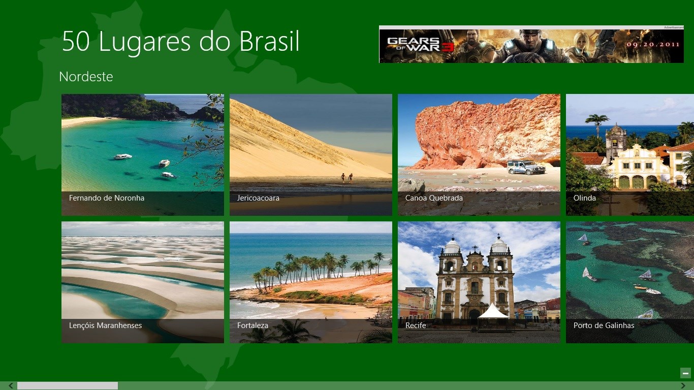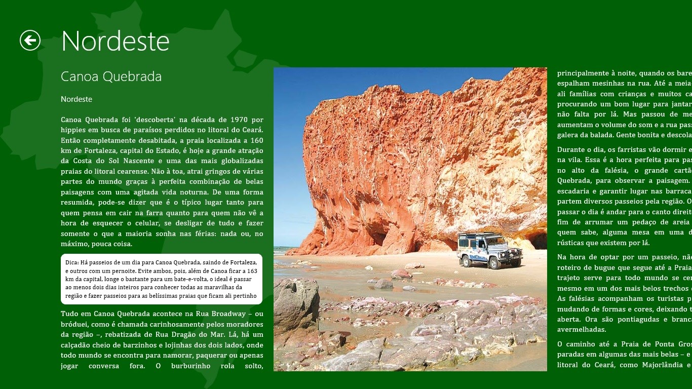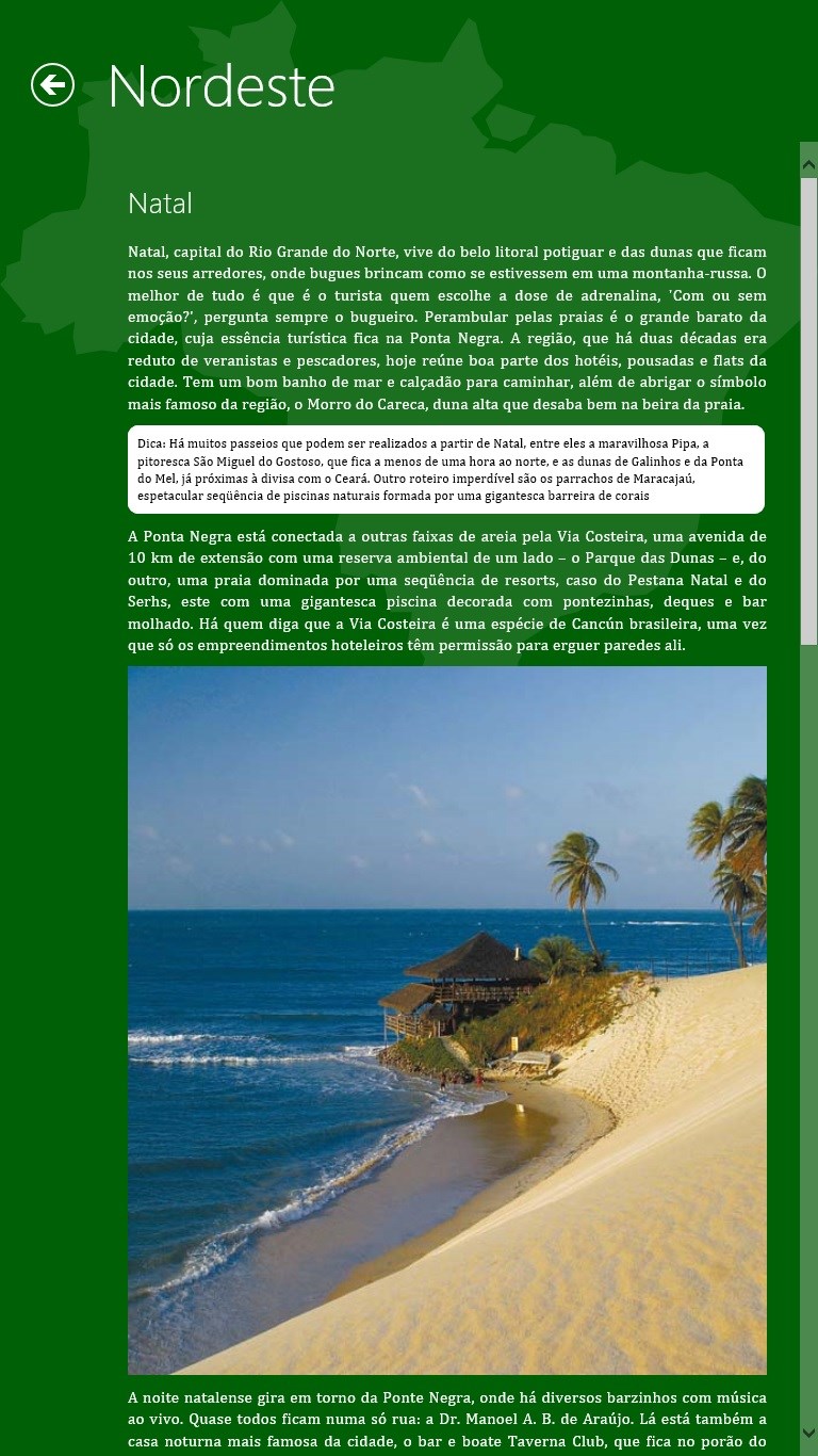 Textos descrevendo os 50 lugares do Brasil e fotos mostrando detalhes de cada um deles.Busca por palavras-chaves e agrupamento por região do Brasil.