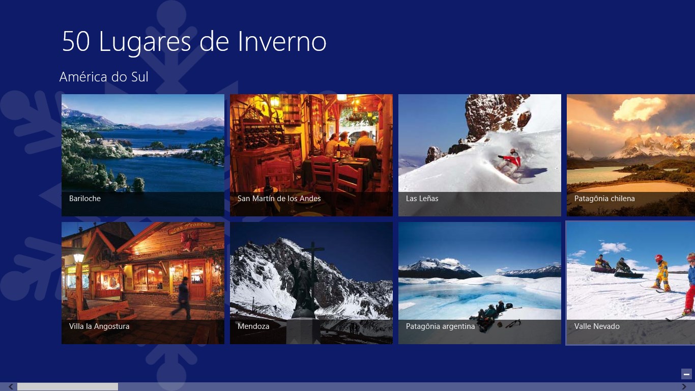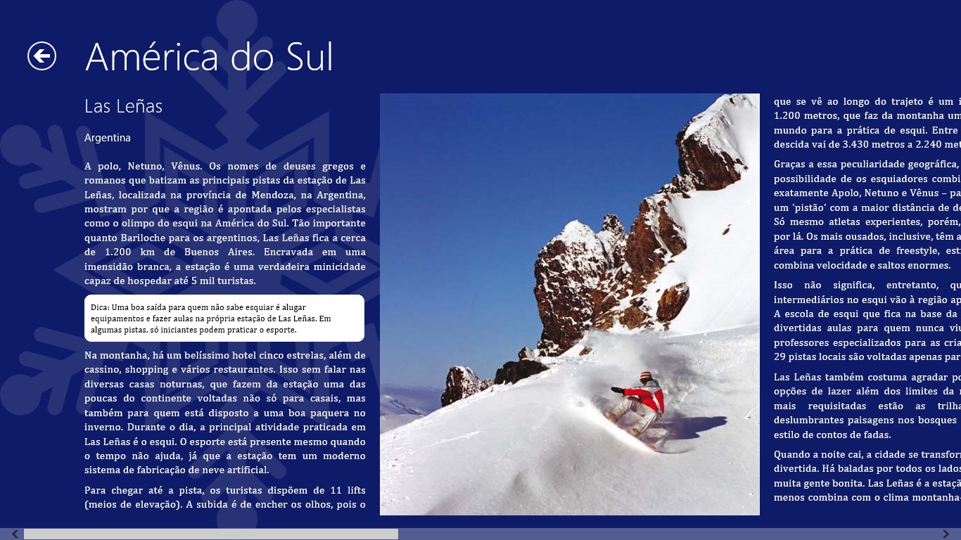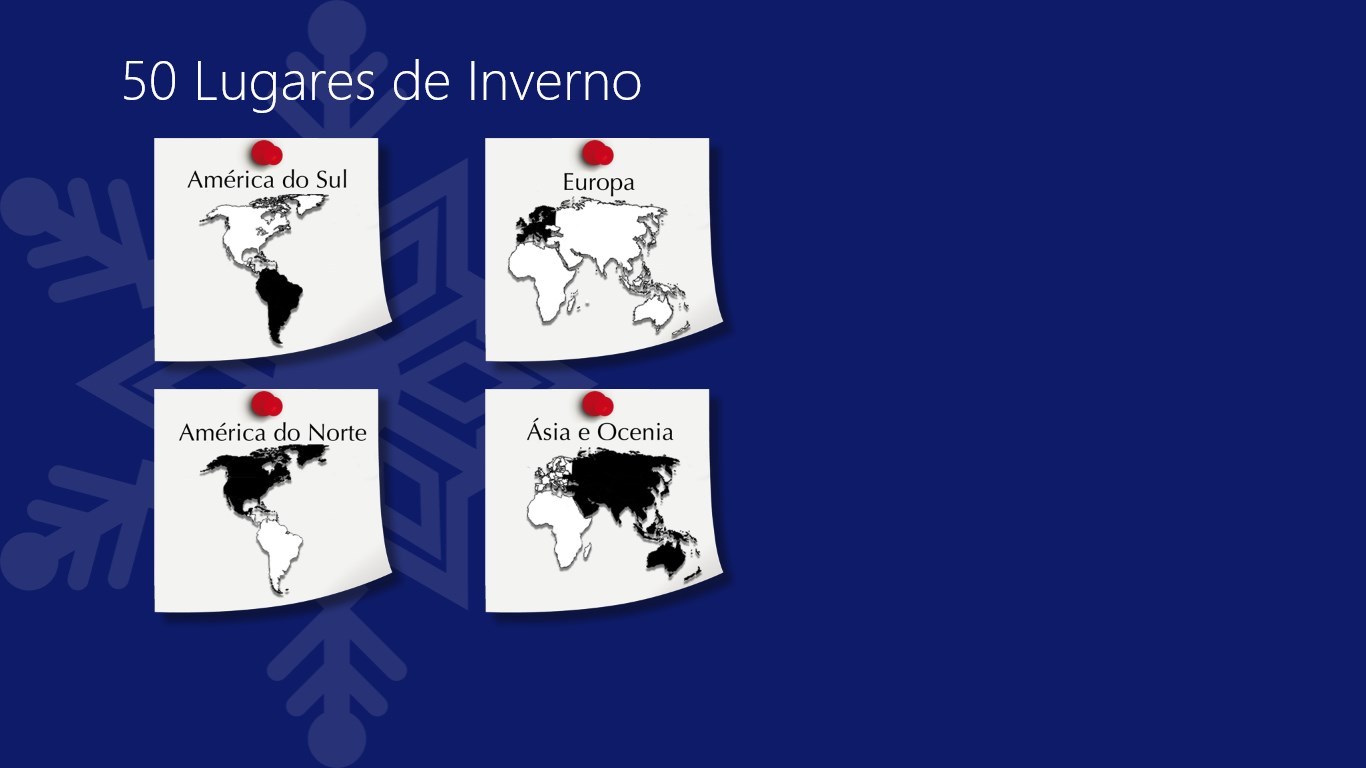 Textos descrevendo os 50 lugares de inverno com fotos mostrando detalhes de cada um deles.Busca por palavras-chaves e agrupamento por continentes.