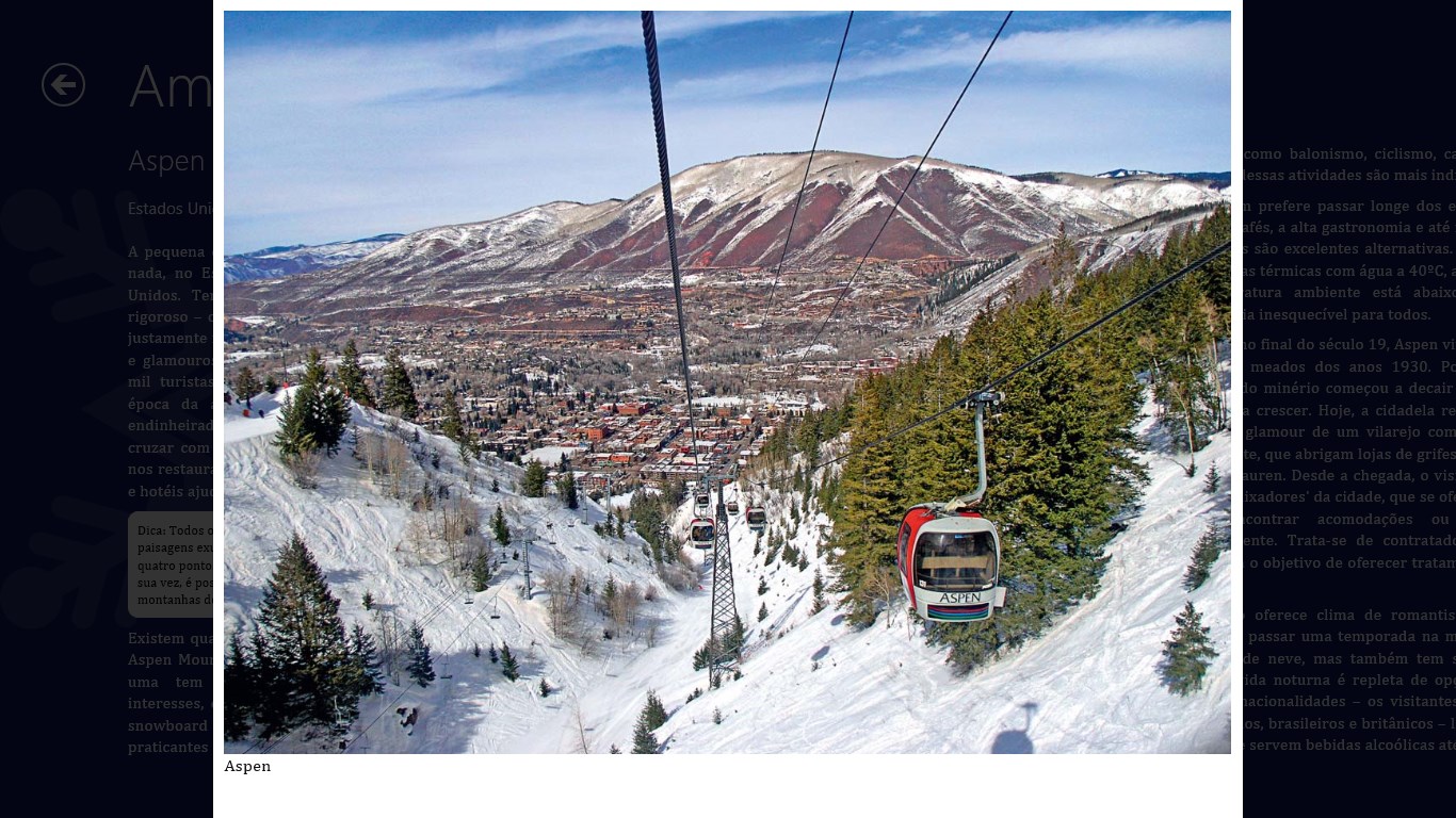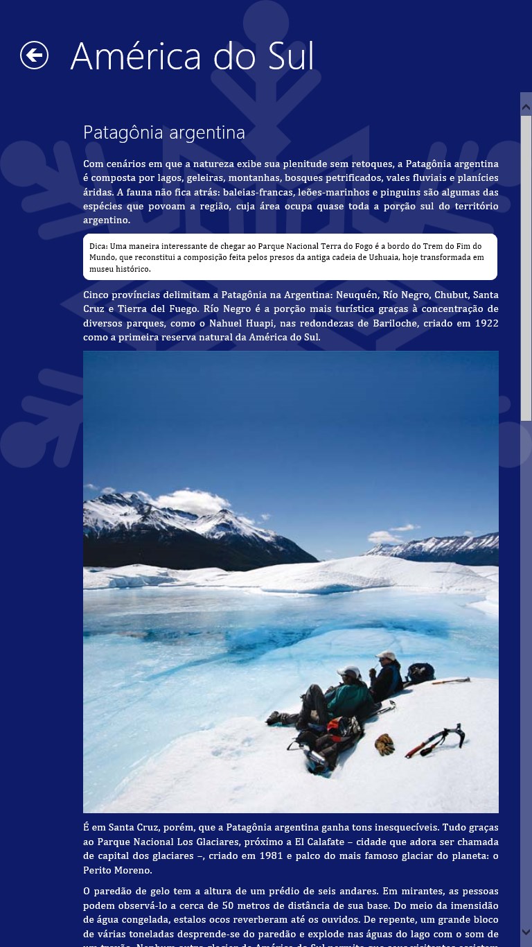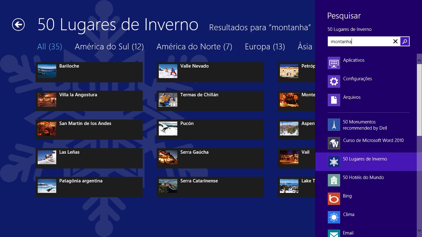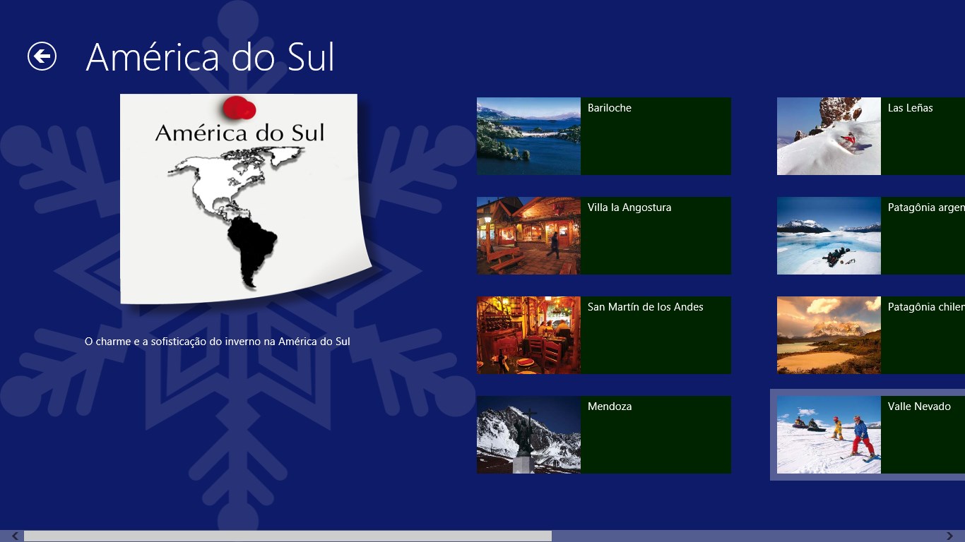 Textos descrevendo os 50 lugares de inverno com fotos mostrando detalhes de cada um deles.Busca por palavras-chaves e agrupamento por continentes.