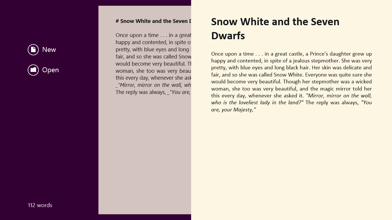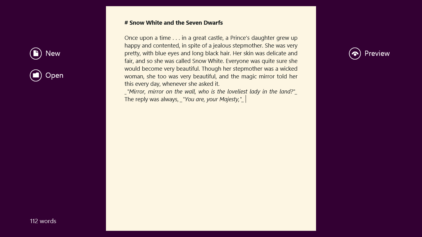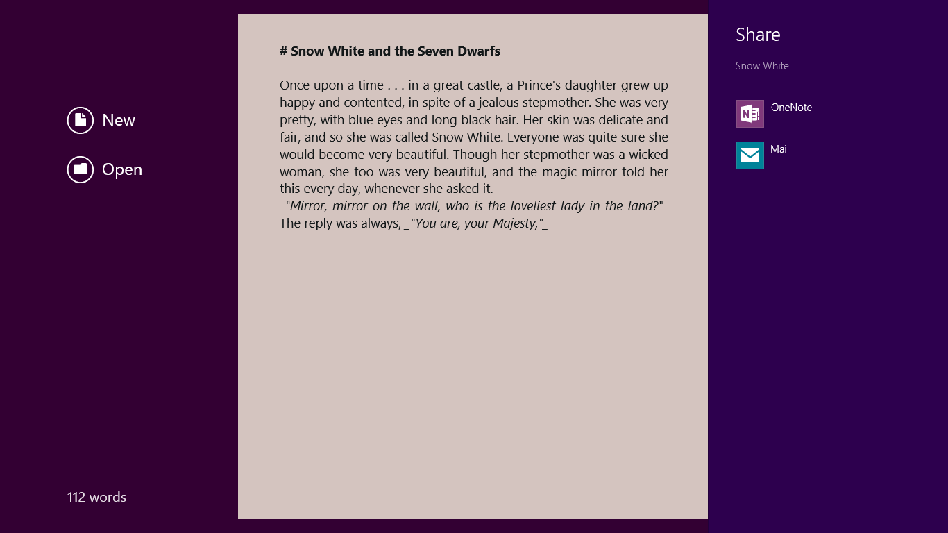 Writing with no distractionsMarkdown syntax for menu-free editingEditor with Markdown syntax highlighting and sentence focusSet a word goal through the Settings charm and get notified when you reach itEasily share data with other apps through the Share charm