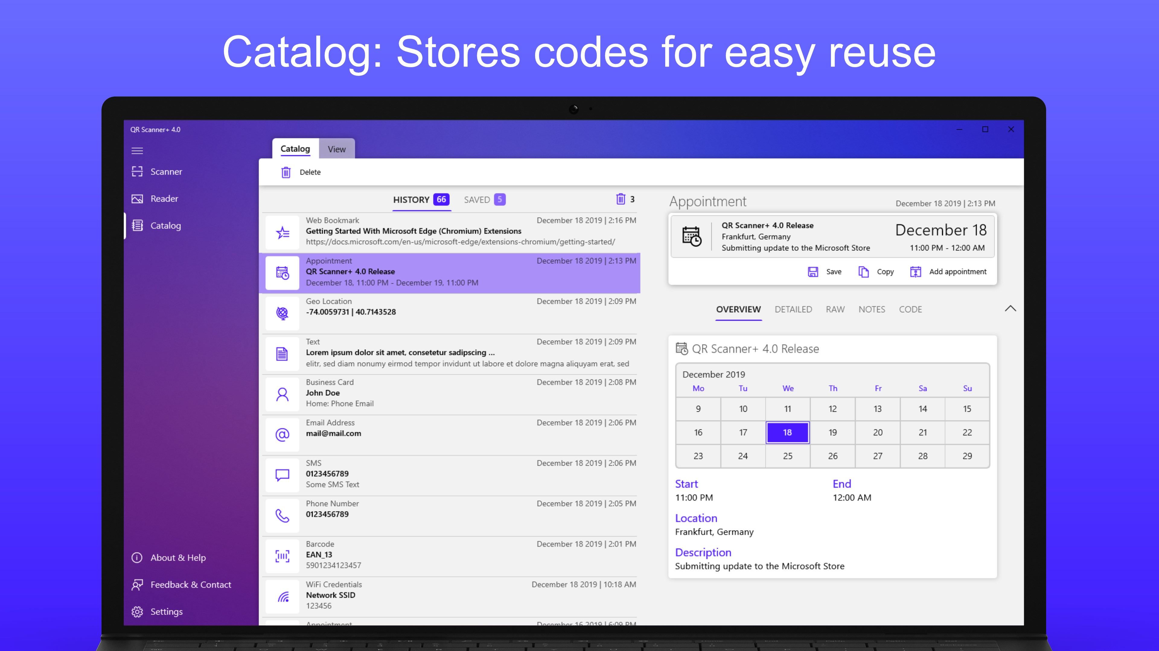 If required, any scanned code can also be stored in the catalog for later reuse.