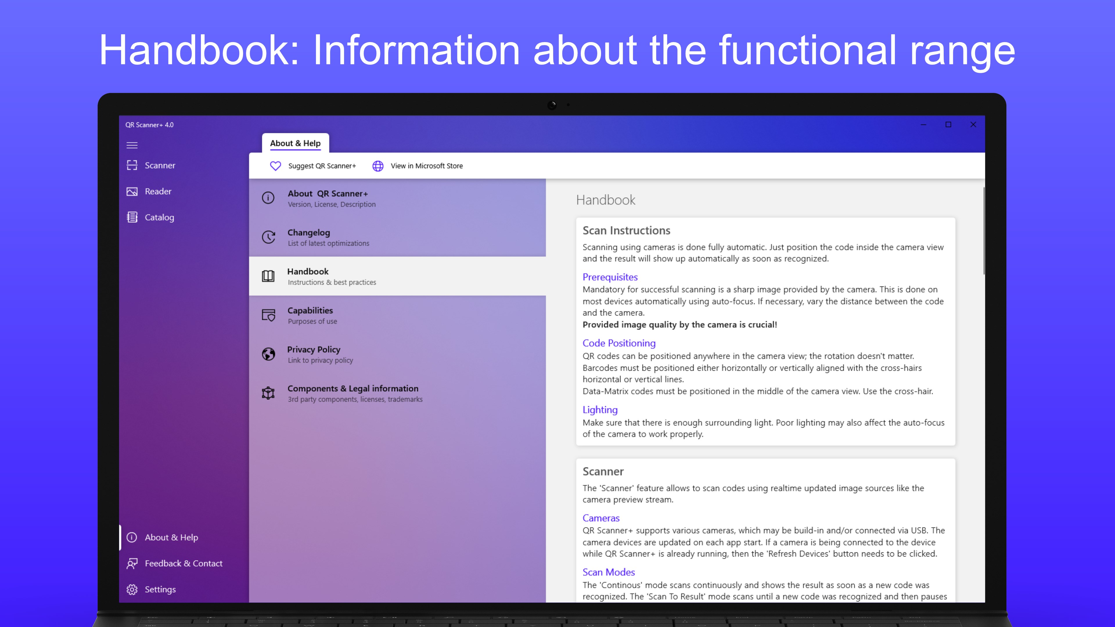The best way is to try QR Scanner+ by yourself and then decide whether it meets your requirements. If this is not the case, you also have the possibility to tell me your wishes or usage requirements via 'Feedback' inside the app. I will try to implement your wishes if possible.