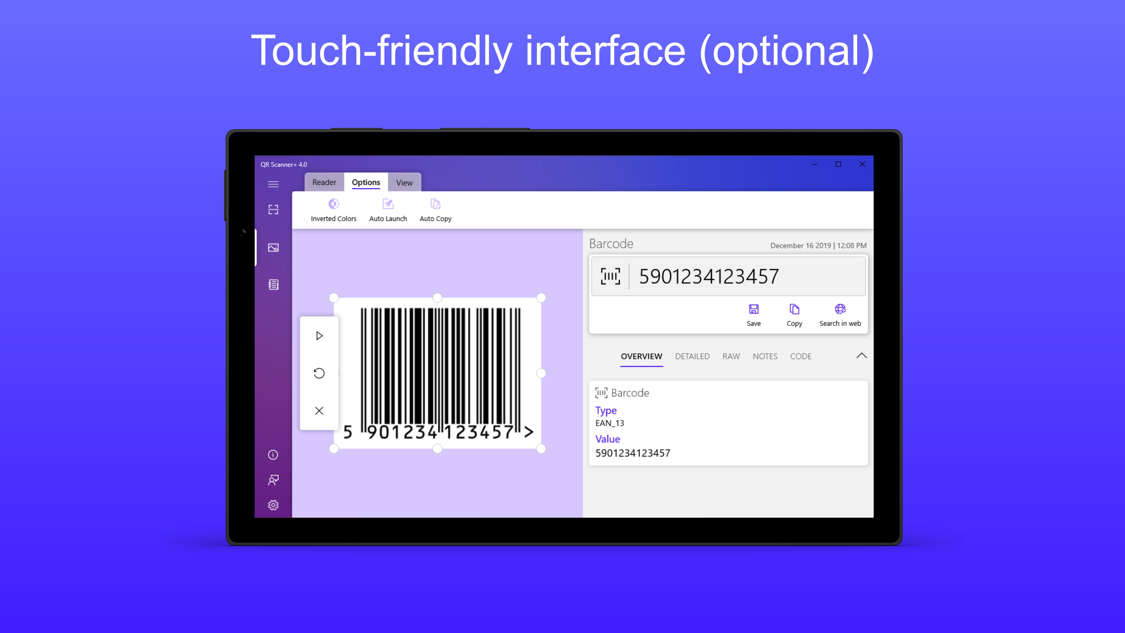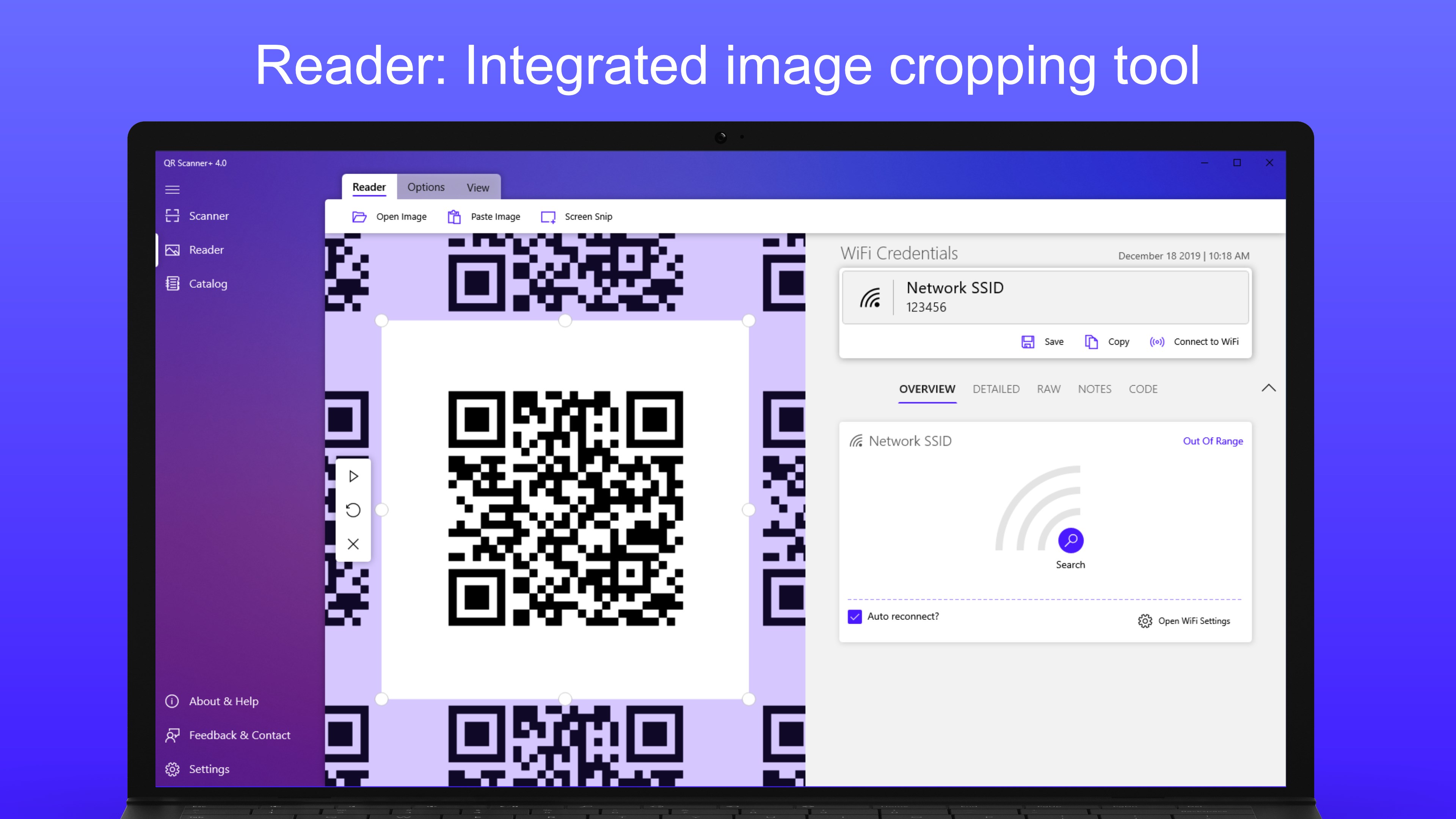 scan codes using the build in camera of your devicescan codes from images stored on your devicesave codes for later useuseful extra features for scanned contentbarcode scanning with custom web searchWi-Fi connection with a single tap (no need to open the Wi-Fi settings)[Mobile] Continuum for phones[Desktop] Drag & Drop @ Reader