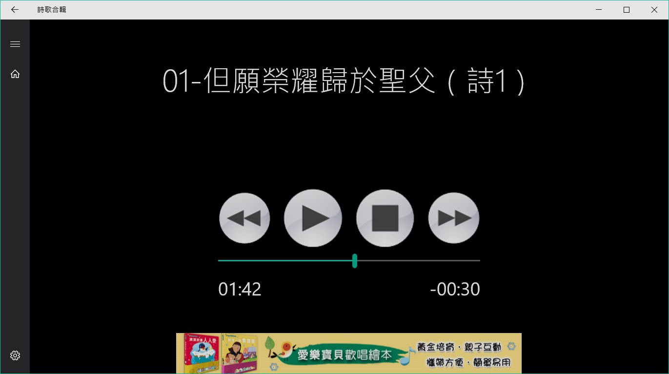 詩歌是人向著神最細嫩的流露。本『詩歌合輯』APP,適用於Windows 10平台。數位內容包含中文詩歌、福音詩歌、選本詩歌一百首、讚美詩集、臺語詩歌、唱詩人選輯、兒童教材詩歌集、兒童詩歌及歷年國際特會訓練標語詩歌等77片詩歌CD,共787首詩歌,總長40小時。盼望幫助聖徒們在日常生活中,隨時隨處滿了向主的歌唱、頌詠。
