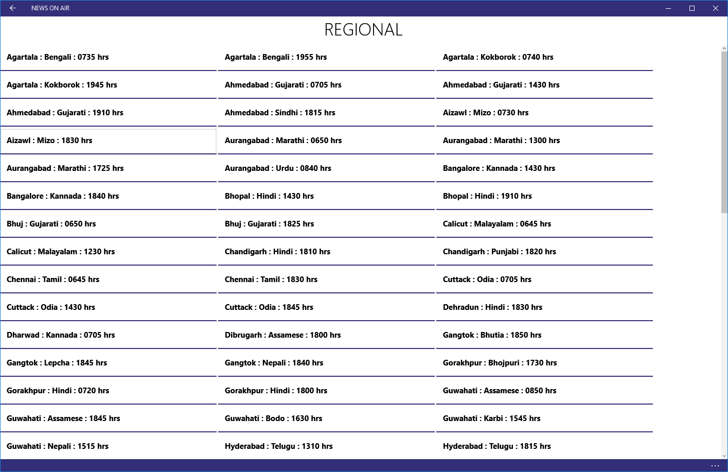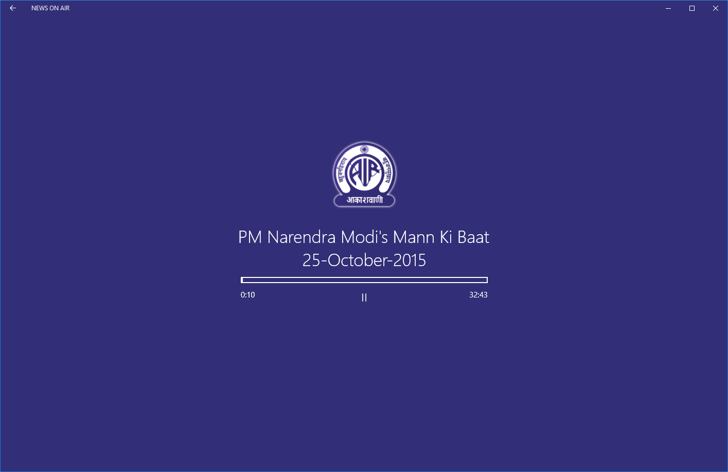 This application presents audio news bulletins in English, Hindi, Urdu and all other Indian languages relayed by All India Radio News Division on National, and local radio channels.