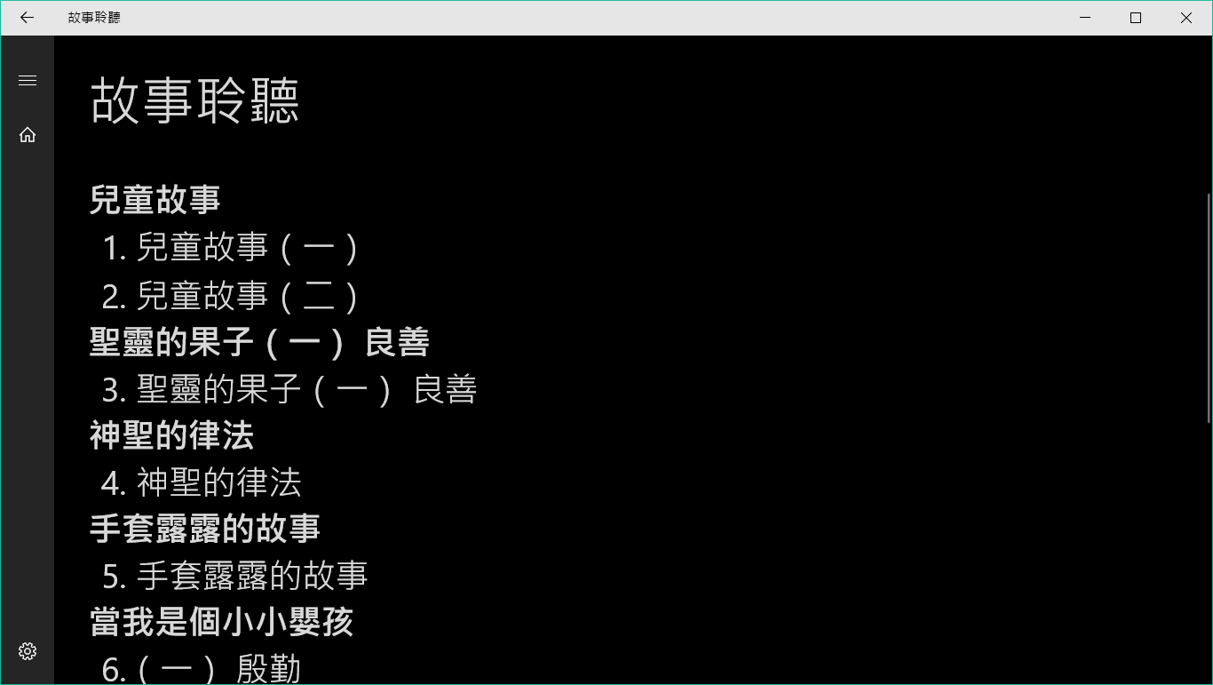 『故事聆聽』有聲APP收錄臺灣福音書房所發行之兒童教材有聲書,包含《兒童故事》、《聖靈的果子(一)良善》、《神聖的律法》、《手套露露的故事》、《當我是個小小嬰孩》等32則有聲故事,適用於Windows 10平台。