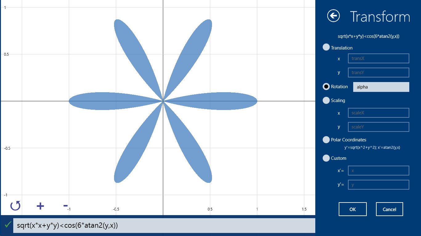 Reliably graphing arbitrary functions, equations or inequations containing two free variables (x, y)Reliably graphing parametric equationsDefine as many parameters as you need in the equations and tune them later interactivelyApply coordinate transformations to your equationShare equations and graphs with other apps