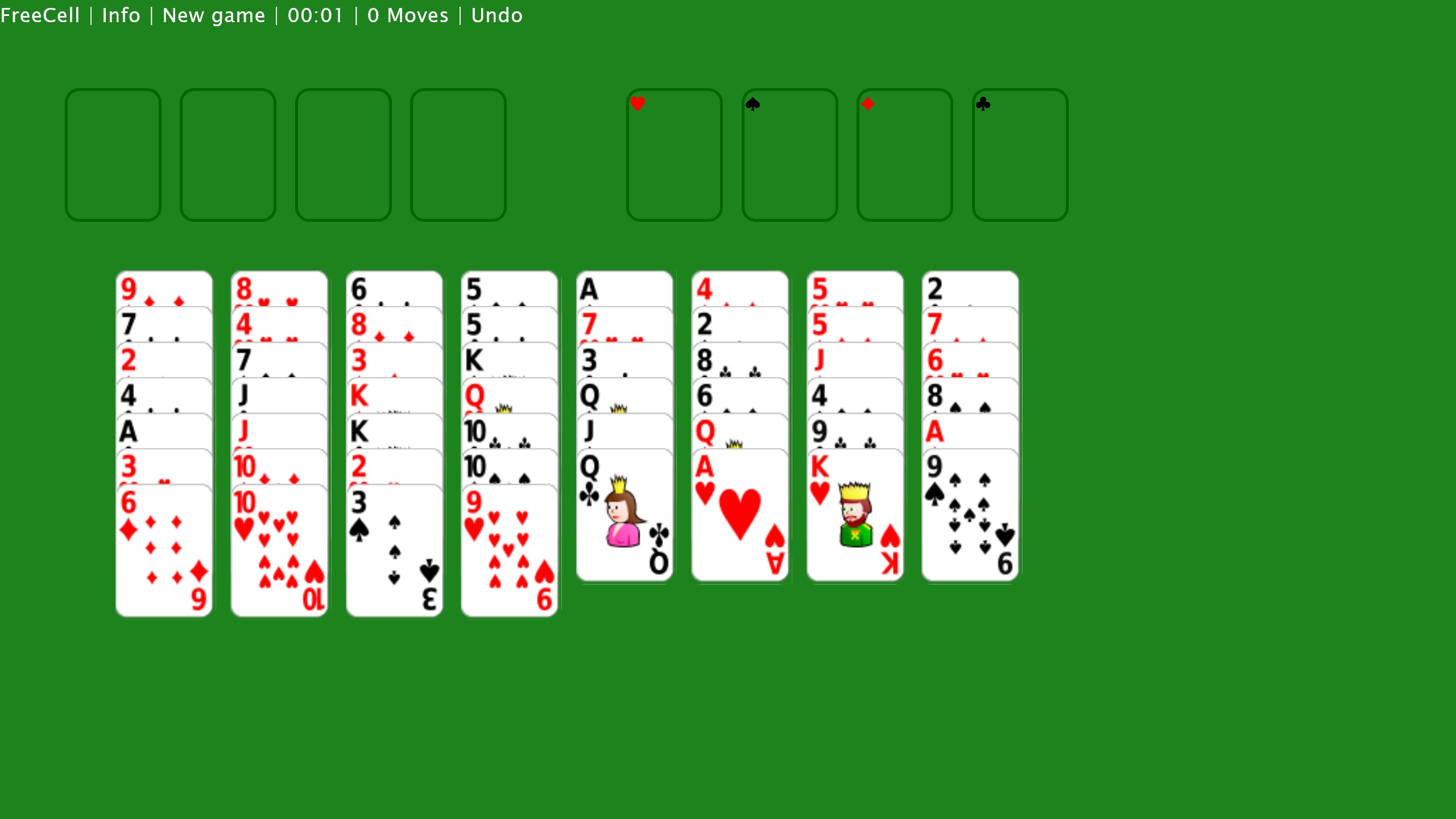 The goal of FreeCell is to create a stack of cards from low to high in each of the four foundation piles in the upper right corner. Each pile can contain only one suit.