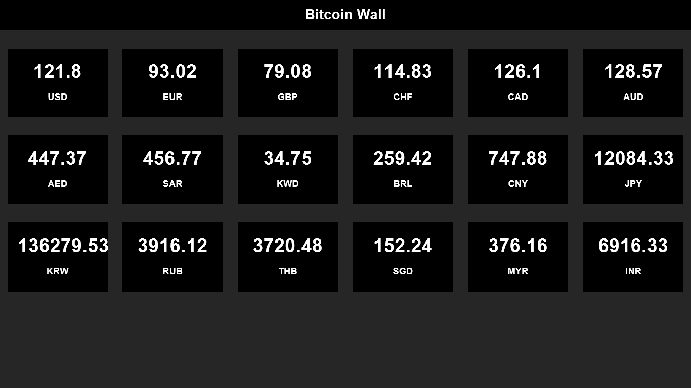 Bitcoin is a digital currency that is being accepted at more places everyday. It allows anonymous transactions worldwide. Bitcoin Wall displays exchange rates of a Bitcoin across most major currencies in the world, such as US Dollar, Euro and Pound. Currently, it shows 18 most traded currencies. Exchange rates are obtained from Coinbase (Bitcoin wallet service).