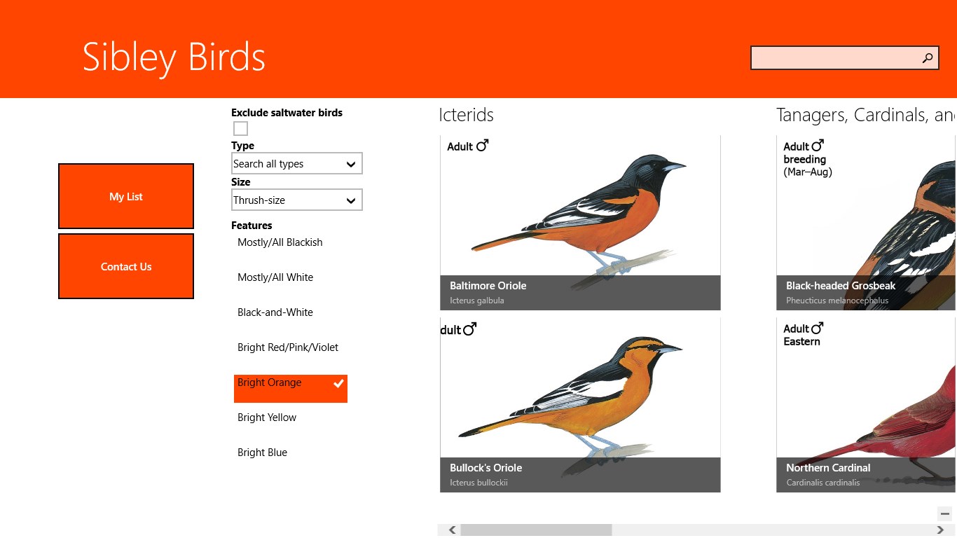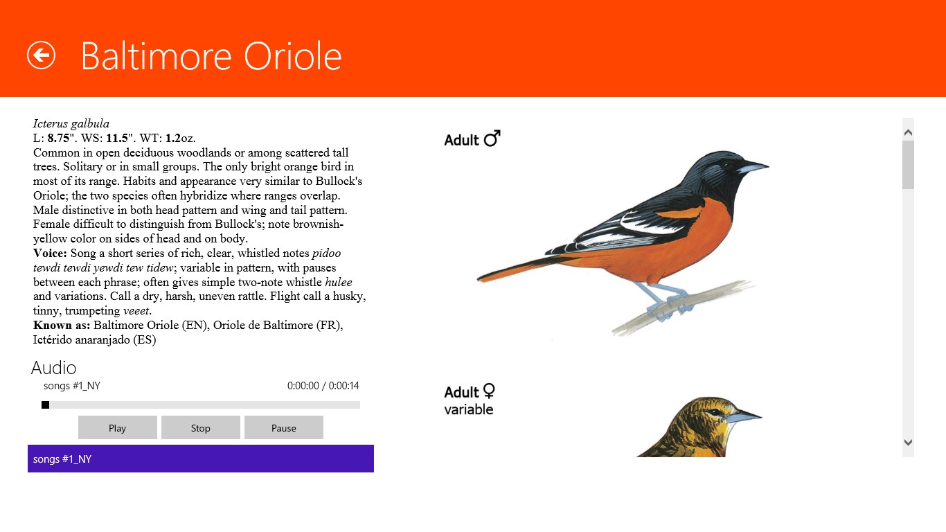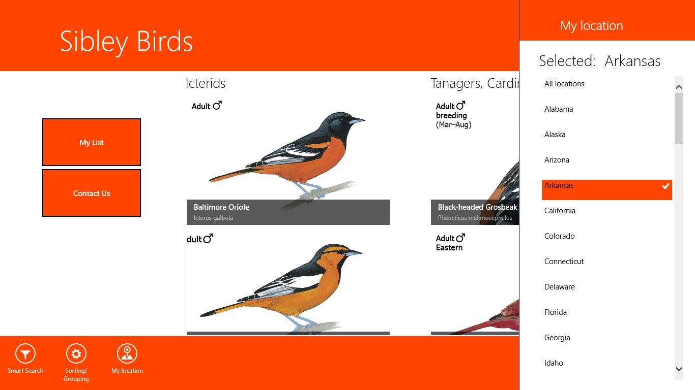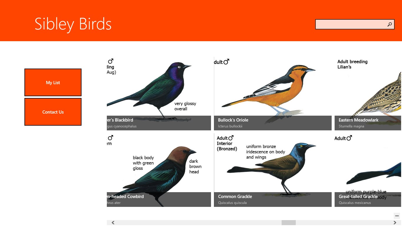 Over 6600 zoomable imagesOver 2300 carefully selected and edited sound recordings. Nearly all species are represented with multiple examples showing the range of vocalizations.The ability to compare any two images, maps, or sounds, side by side on the screenThe ability to filter by state/province, so that you see only the species likely to occur in your location, and to further reduce the possibilities to the most common birds in that areaThe ability to search by distinguishing features such as size, prominent colors, habits, and groupA basic personal species list* that stores your sightings saved to the device.Sorting of the birds list by taxonomy or alphabeticallyGrouping of the birds by taxonomy or familyDistribution maps of the birdsGPS capabilities to record your bird sighting coordinates