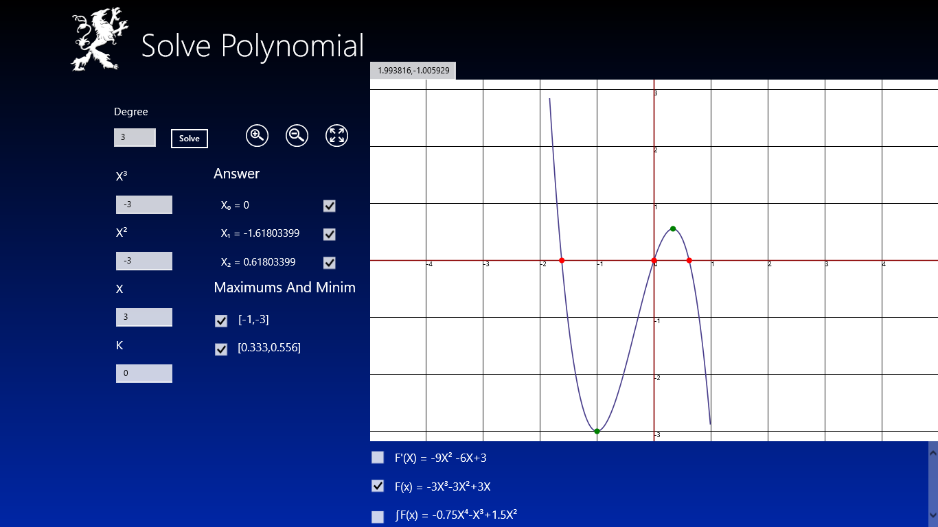 Excellent app which solves any polynomial instantly! It does not matter the degree or complexity of the polynomial, if a real solution exists, the app will find it, that simple! The app shows a graph which is capable to show the minimums, maximums, integral and derivative of the polynomial.
