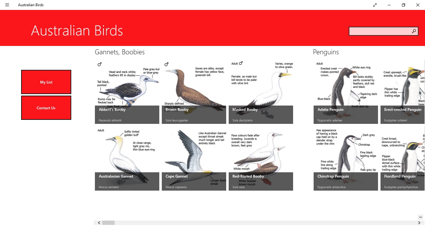 Over 3000 hi-res bird images covering over 790 bird species.Most bird species have a detailed distribution map showing any subspecies that occur.Detailed text descriptions of almost all bird species including songs and calls, measurements and breeding behaviour.Over 1800 carefully-selected and edited sound recordings for over 600 species. Many species are represented with multiple call examples showing the full range of vocalizations.The ability to compare any two images, maps, or sounds, side by side on the screen. The ability to filter by geographic location, so that you see only the species likely to occur in your location, andA \“Smart Search\” that gives the ability to search by distinguishing features such as size, colour, physical features, habitat and exclude certain types of birds (eg. Passerines).A basic personal species list that stores your sightings saved to the device