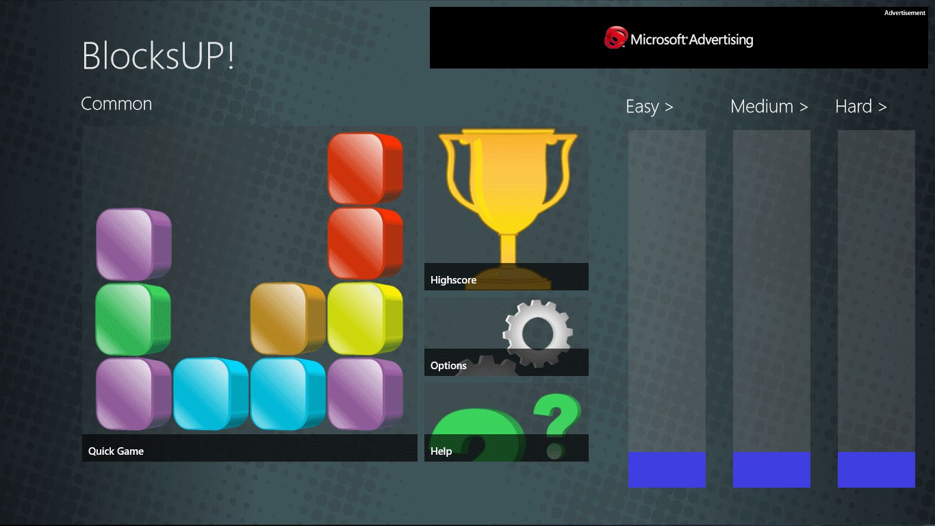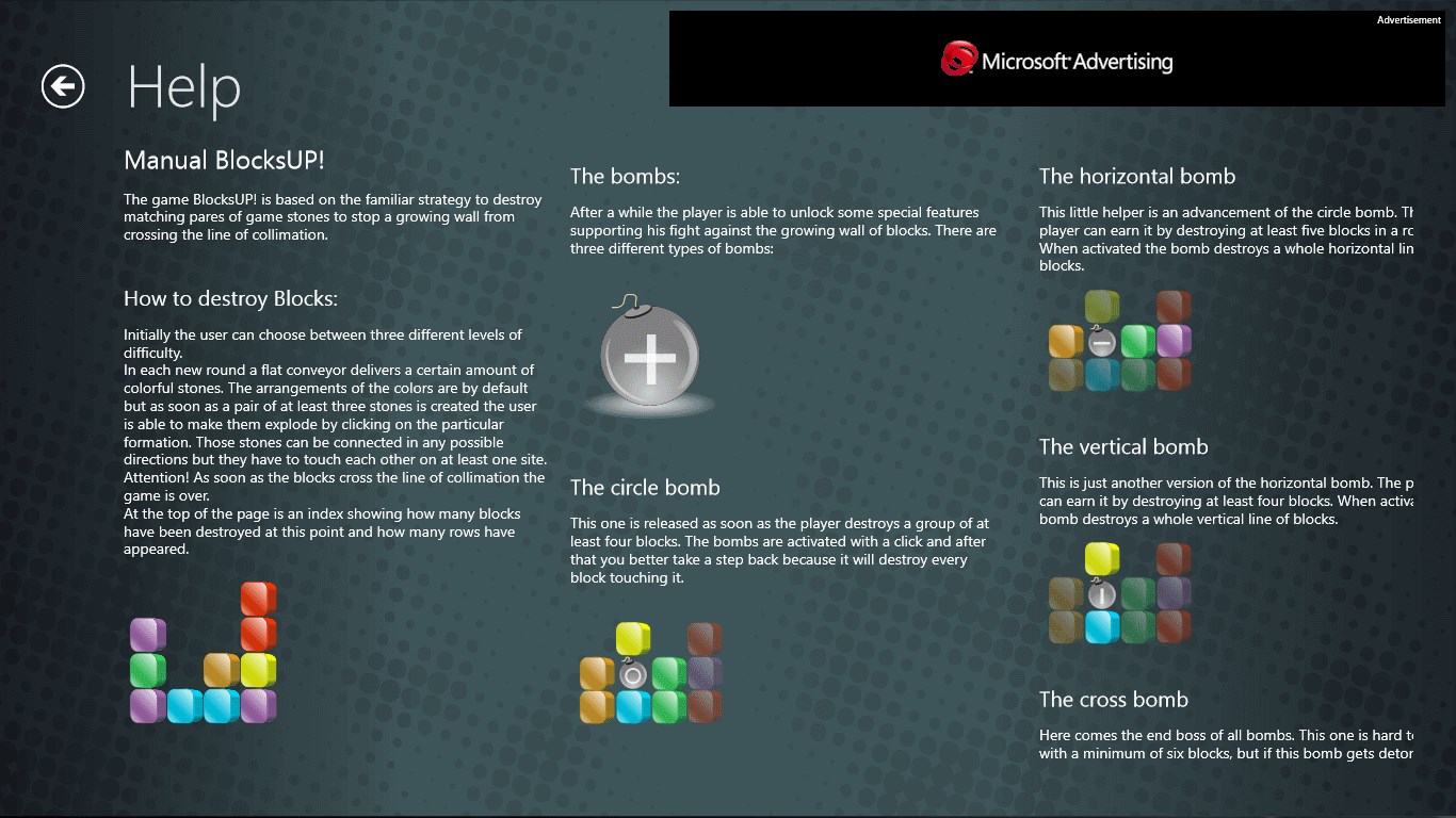 BlocksUP! is a horizontal version of the well knows Tetris gameplay. To prevent an overflow of different colored boxes they can be removed by pairing or using different types of bombs. Can you make it into the highscores? Warning, highly addictive!!!