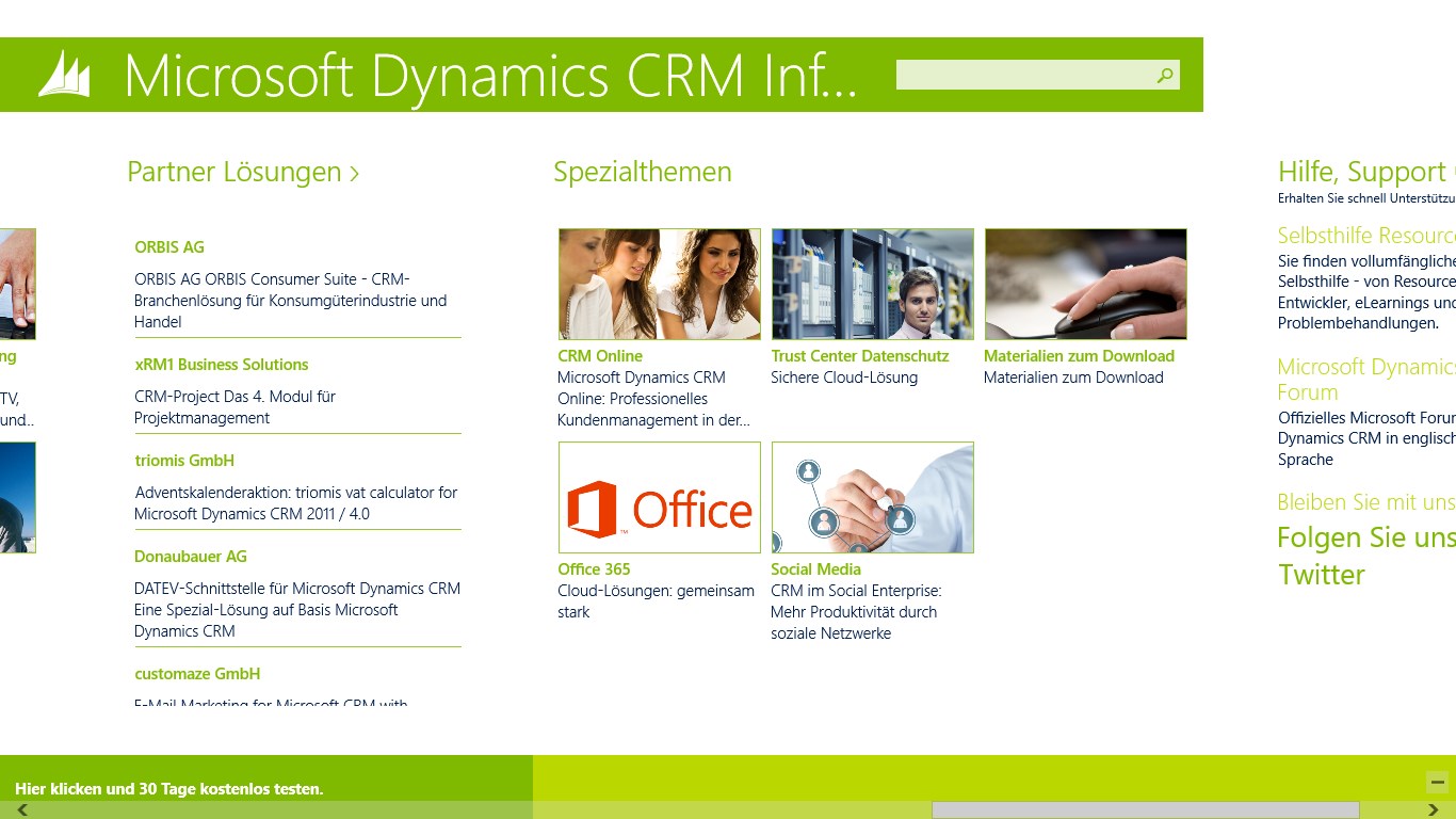 Umfangreiche und aktuelle Informationen zu Microsoft Dynamics CRMDynamics CRM Lösungen für alle Branchen und EinsatzbereicheAktuelle Kundenreferenzen, Anwendungsbeispiele und FallstudienAlle Informationen und News auch ohne InternetverbindungMicrosoft Dynamics CRM 30 Tage TestversionTeilen von InhaltenDurchsuchen von Inhalten