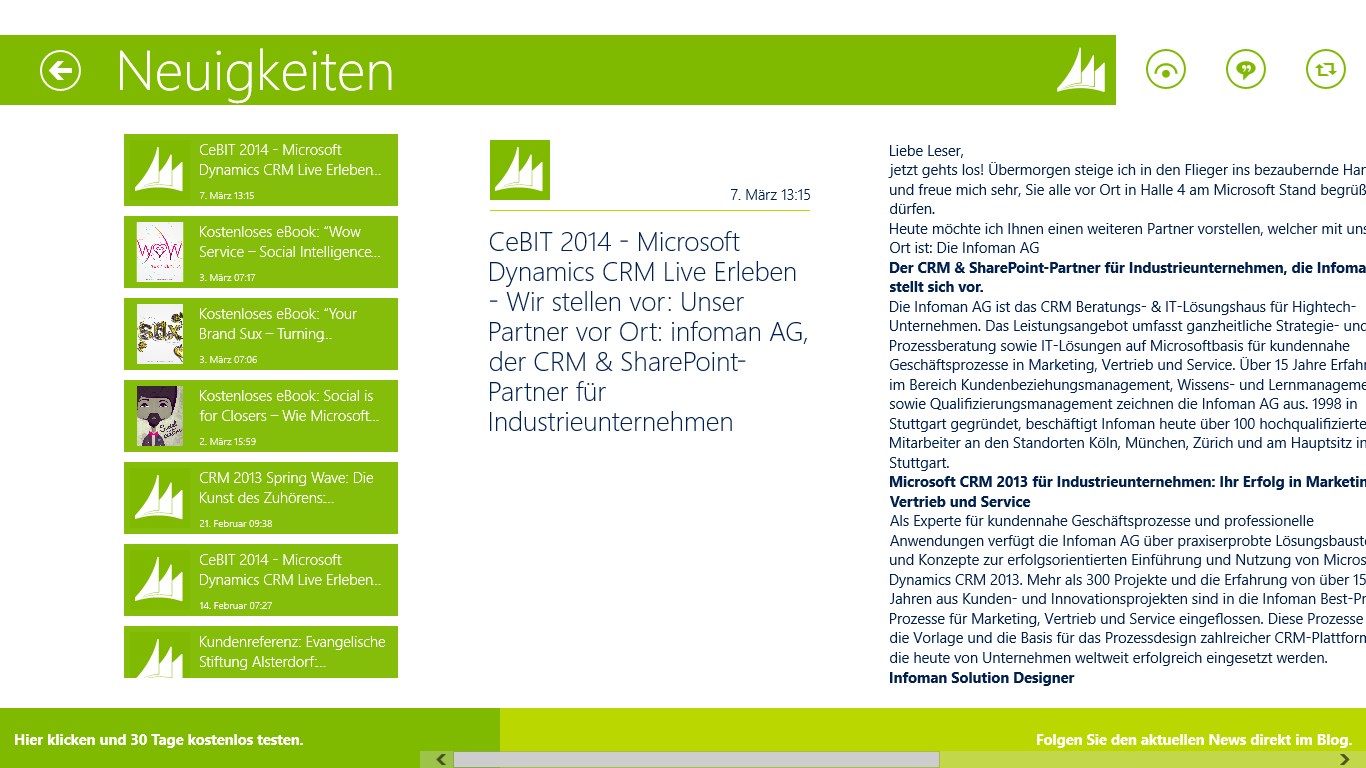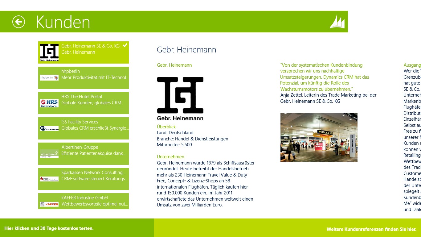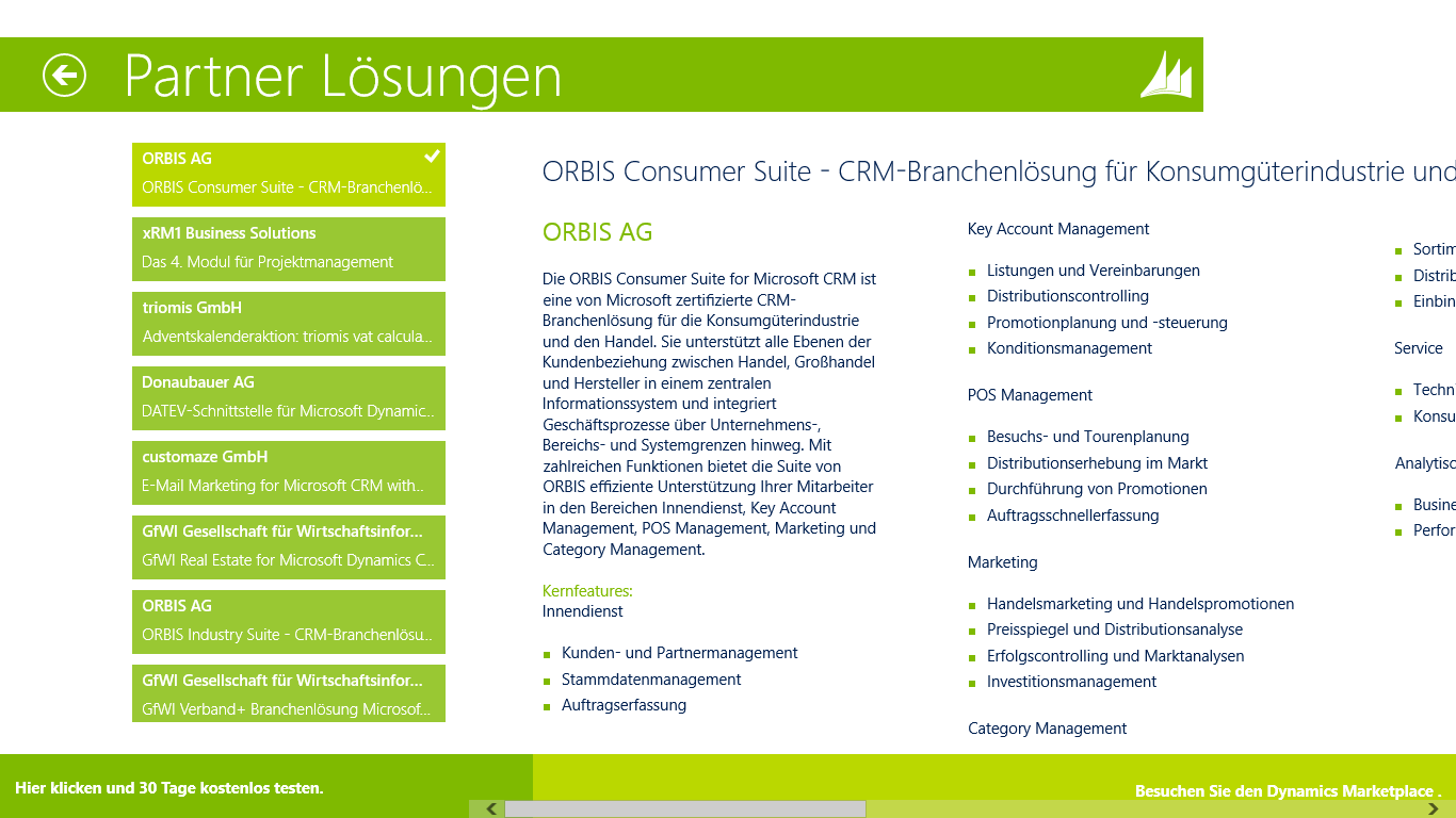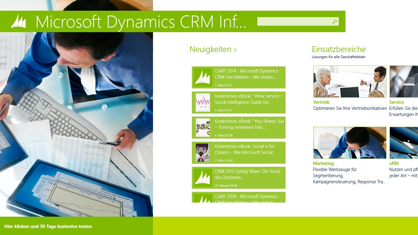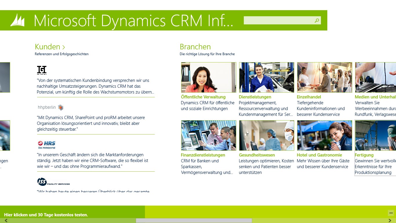 Das Microsoft Dynamics CRM Infocenter bietet Ihnen auf Basis von Windows 8 innovativ, komfortabel und übersichtlich alle relevanten Informationen zu Microsofts Customer Relations Management Lösung Dynamics CRM. Lernen Sie die Einsatzszenarien und Vorteile von Dynamics CRM und CRM Online kennen, lassen Sie sich von Kundenreferenzen inspirieren, finden Sie die passende Partner- und Branchenlösung für Ihr Unternehmen und bleiben Sie immer auf dem Laufenden zu allen Themen rund um Dynamics CRM.