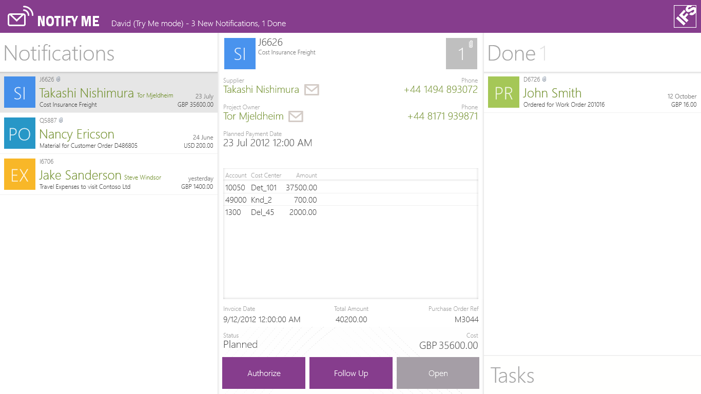 IFS Notify Me tells you when there are new business events requiring your attention and action. The notifications are shown in a single unified list where you can view details and take action such as Approving or Authorizing immediately.