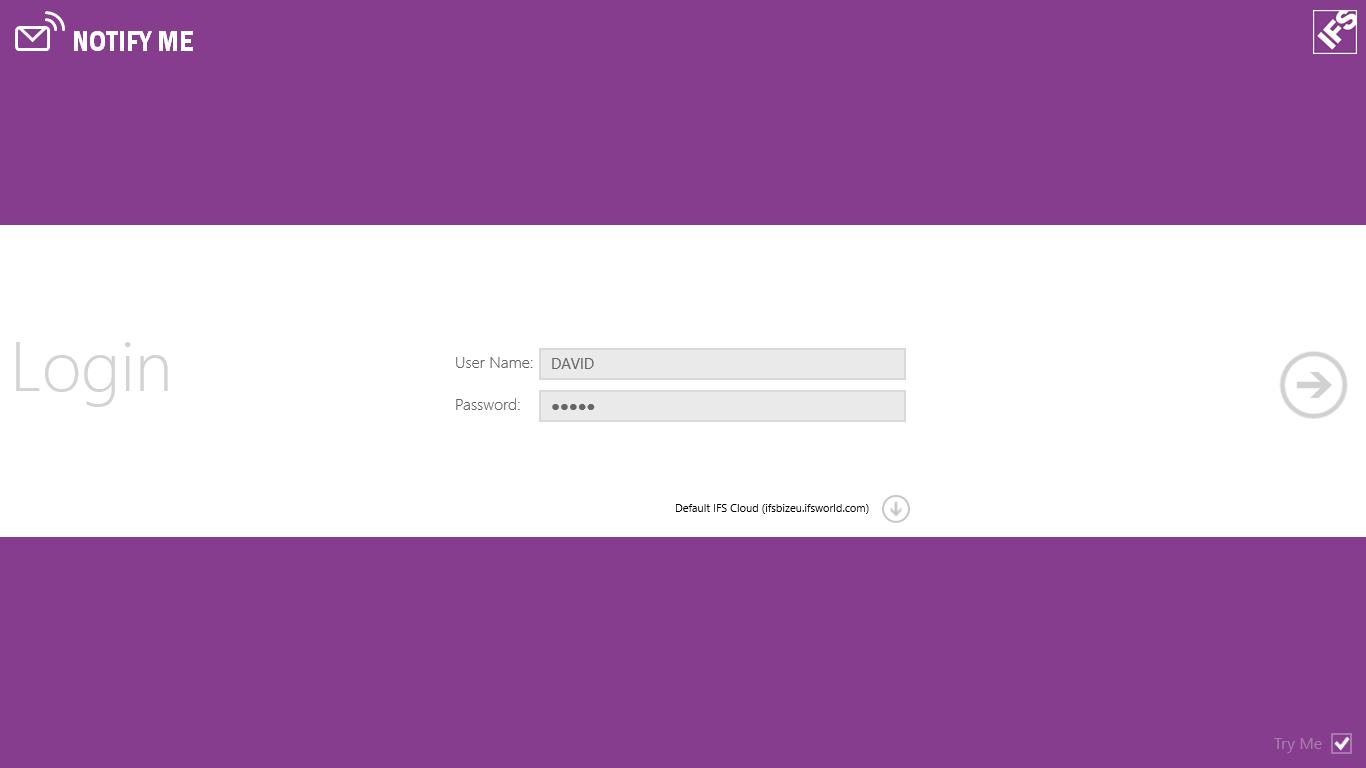 IFS Notify Me can be used in Try Me mode with demo data without requiring a log on or network connection. Use of IFS Notify Me connected to your company’s IFS Applications installation(s) requires that your company has a valid IFS Touch Apps subscription.