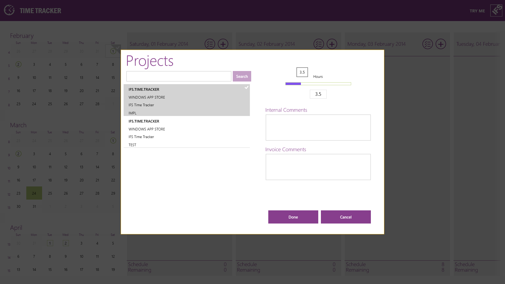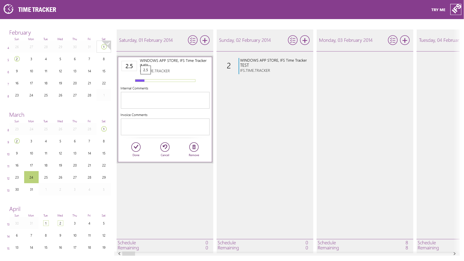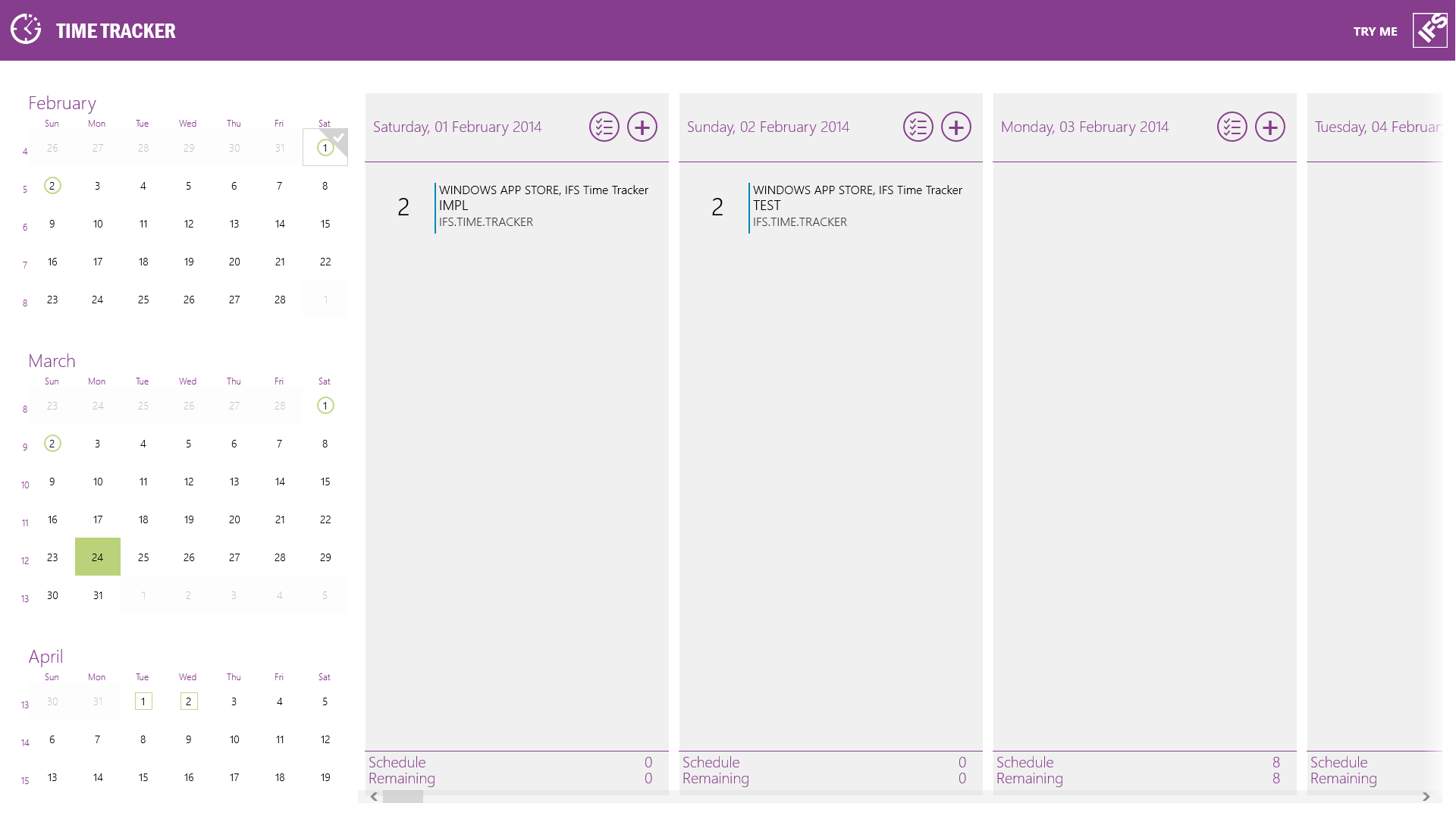 IFS Time Tracker can be used in Try Me mode with demo data without requiring a log on or network connection.
