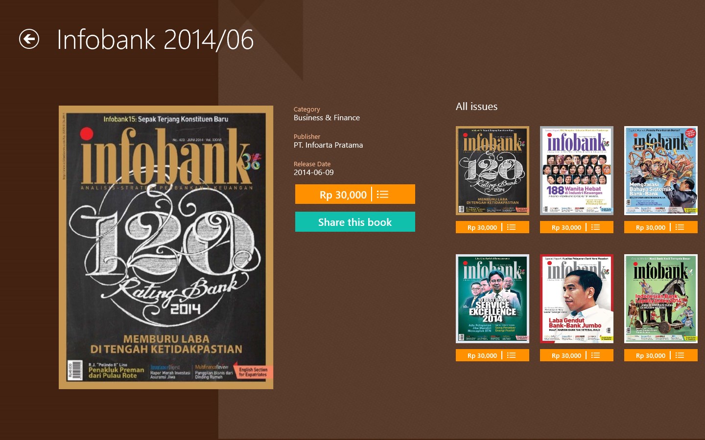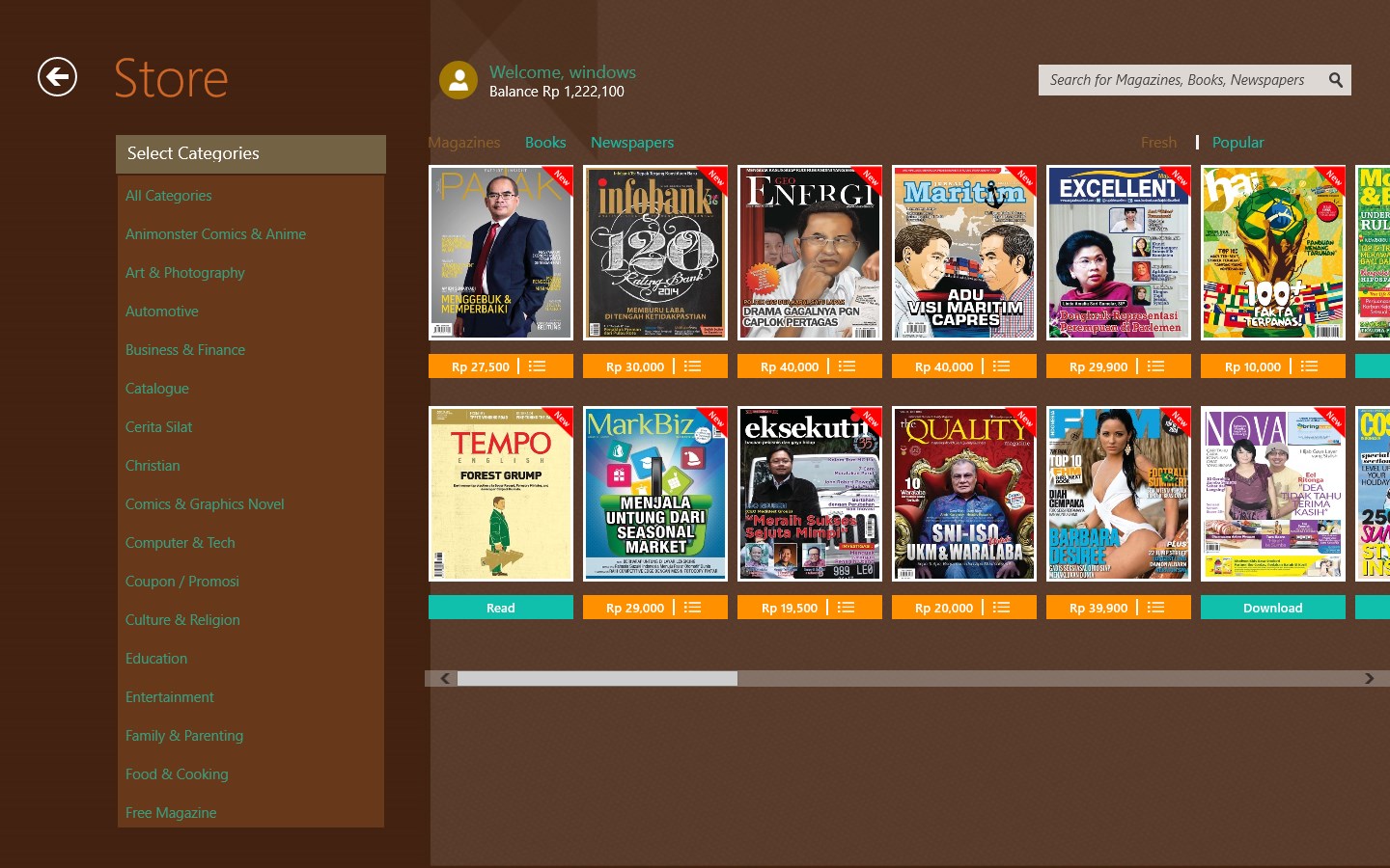 Wayang e-Reader is an application that allows you to read magazines, books, comics and newspapers on your smartphone and tablet. We have over 20,000 contents from local (Indonesian) and international publishers such as Megindo, Gramedia, Kompas, MRA Group, Grafindo, Gatra, Tempo, SWA, Mizan, Koran SINDO, Popular, and many more.