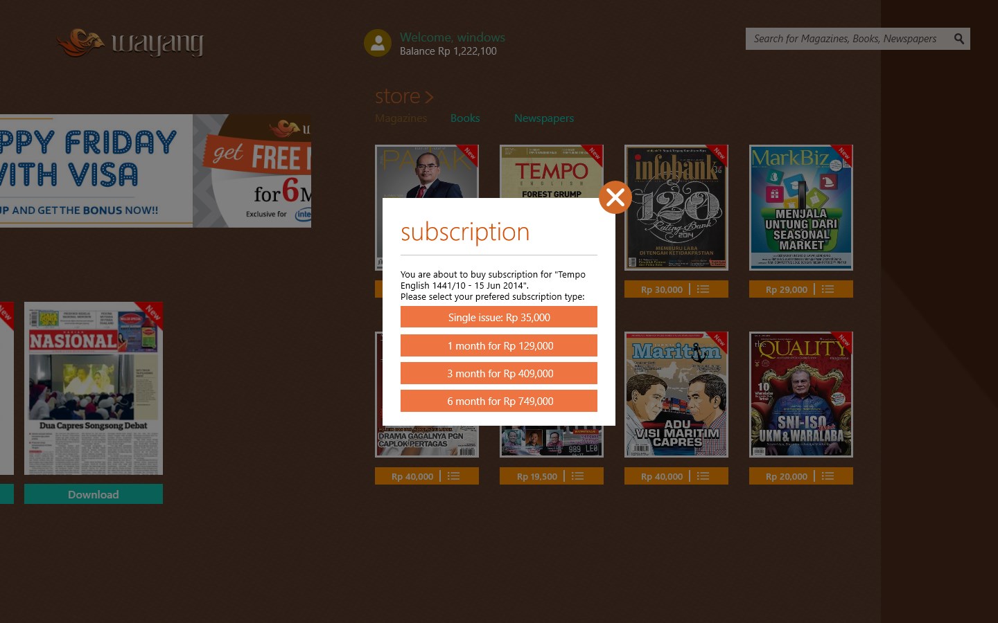 To buy magazines, books, comics, or newspapers, user can register for an account in the apps or through our website www.wayang.co.id and after the account is created, user can Top-Up a balance into his/her account.