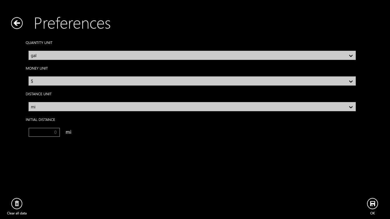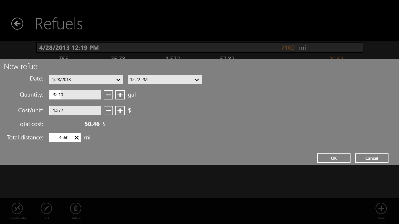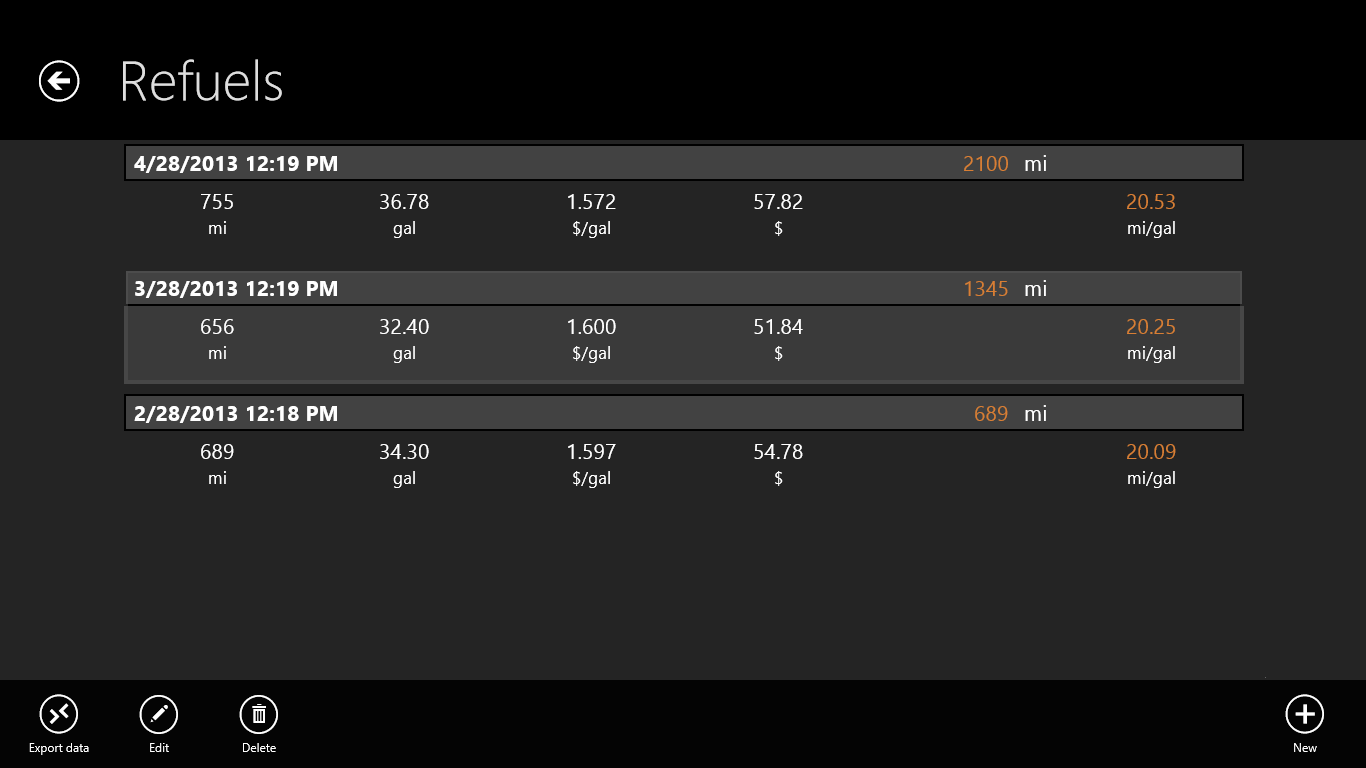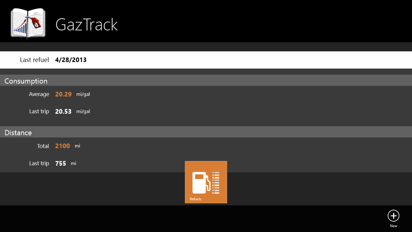 User friendly interface: it\'s fast to add a new refuel entry; it remembers some of the settings to save your input timeList all you refuel history in a table view with all important informationConfigurable American/Metric unitsData export in CSV formatStatistics: Global average car consumption (MPG), Last Trip consumption, Last Trip driven distance, Total driven distance