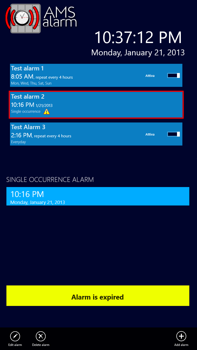 Advanced alarm manager which supports predefined alarm repeat scheduling (set a start time and repeat every N hours), specific days of the week activation or single occurrence events. If enabled, notifications are shown even when the app is not running, on the app tile in the Start screen and in the lock screen, even when your PC or tablet is locked.
