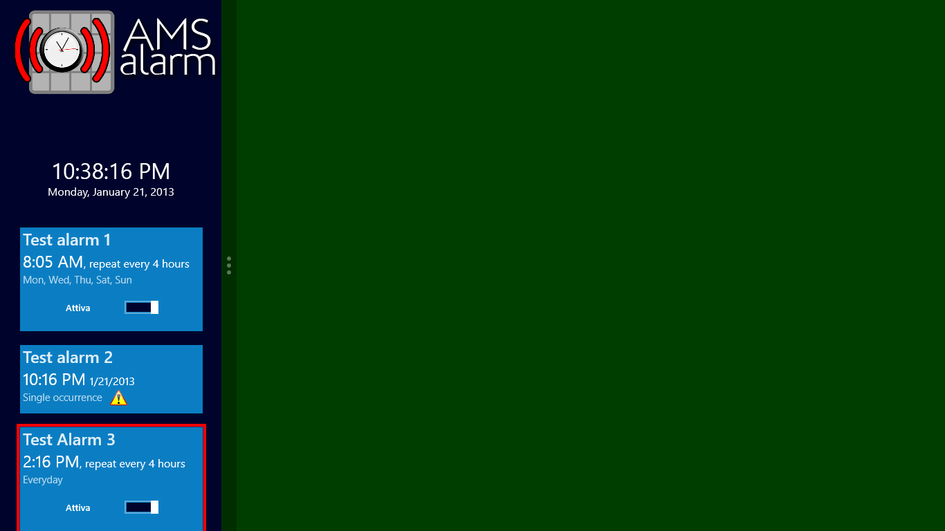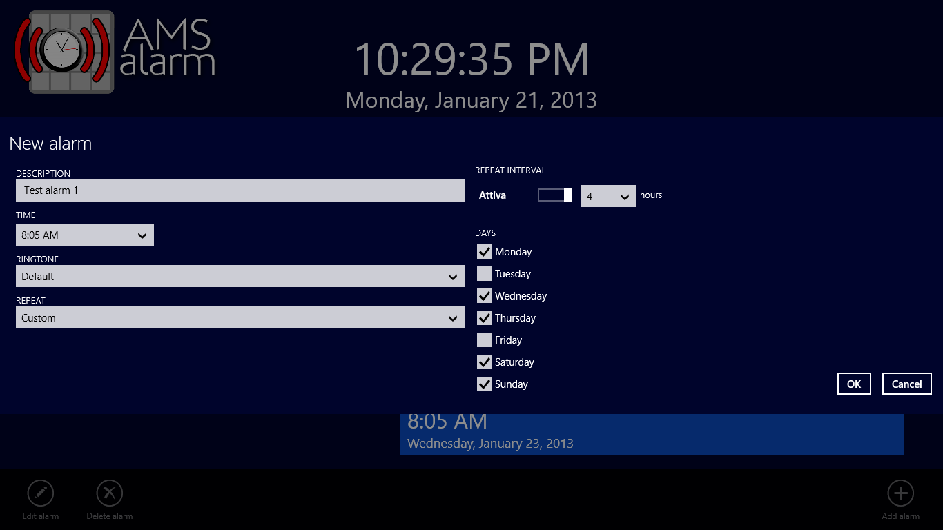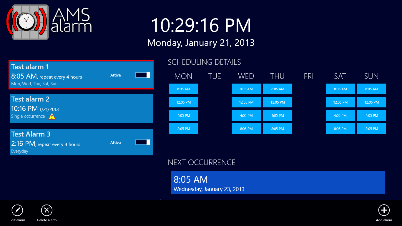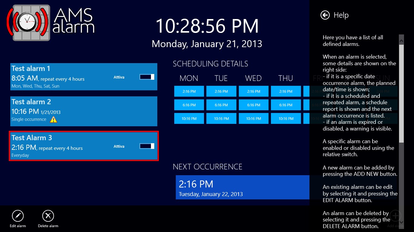 Advanced alarm scheduler: one-shot events, day-based scheduling, repeat every N hoursIntuitive and very easy interfaceCustomizable alarm ringtonesNotifications available when the app is closed (if app notifications are enabled)Notifications available when the PC or tablet is locked (if background execution and lock screen notifications are enabled)Multi-language support (English / Italiano)