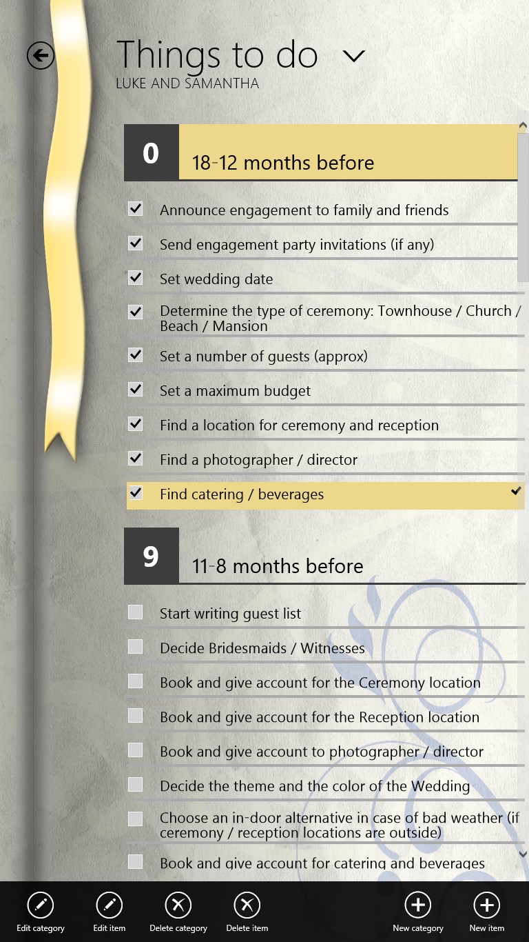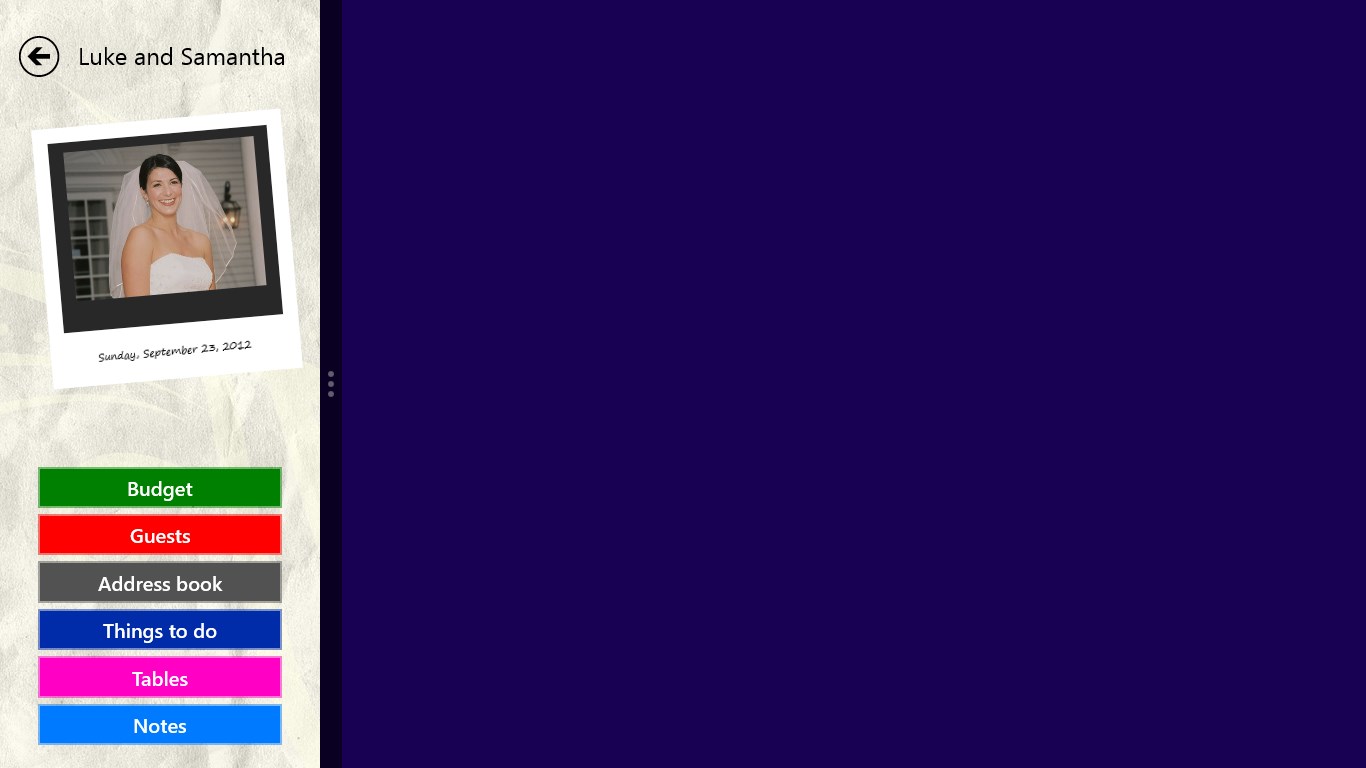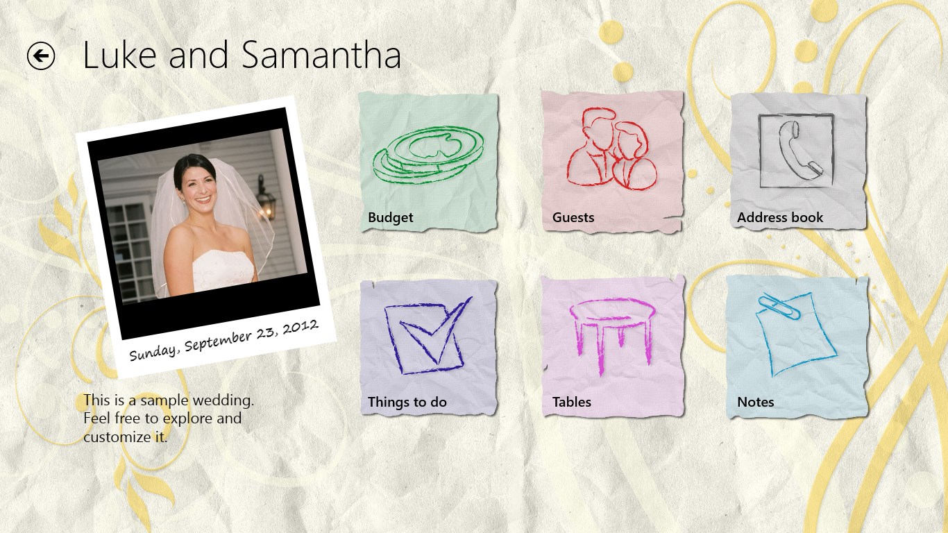 Whether you are planning your Wedding or your daily work is to plan Weddings for customers, "The Wedding Planner" is the organizer app that will help you to manage and keep track of all the vital information about that special Day, easily. Keeping on top of many wedding plans couldn't be simpler! Using The Wedding Planner for Windows 8 is the easiest way to ensure even the smallest details aren't forgotten.