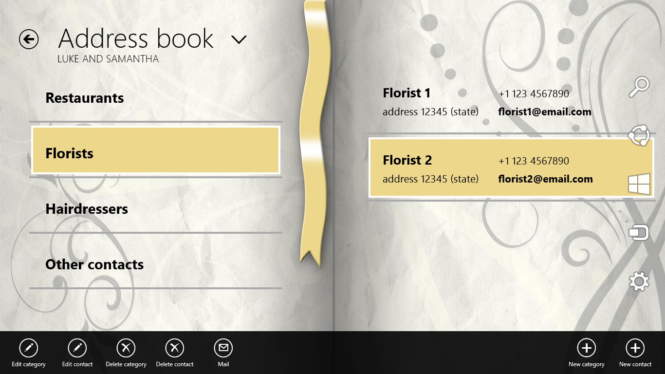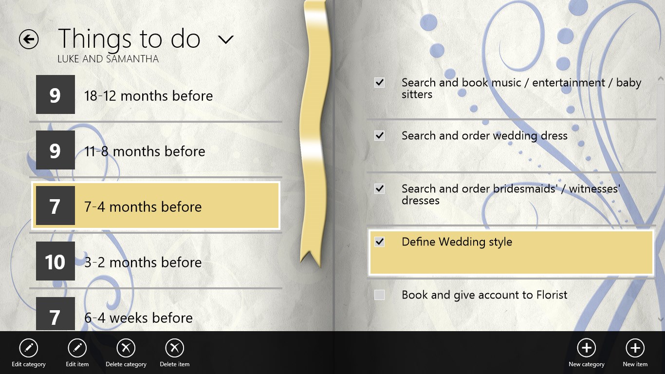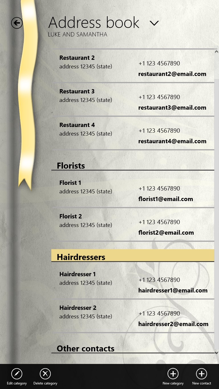 Whether you are planning your Wedding or your daily work is to plan Weddings for customers, "The Wedding Planner" is the organizer app that will help you to manage and keep track of all the vital information about that special Day, easily. Keeping on top of many wedding plans couldn't be simpler! Using The Wedding Planner for Windows 8 is the easiest way to ensure even the smallest details aren't forgotten.